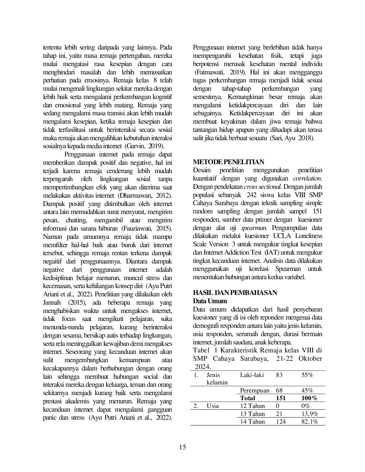 KebKebRemaja merupakan kelompok yang rentan mengalami kesepian akibat perubahan sosial dan psikologis yang mereka alami. Kesepian yang berkepanjangan dapat mendorong remaja untuk mencari pelarian melalui internet, yang pada akhirnya dapat menyebabkan kecanduan internet. Penelitian ini bertujuan untuk menganalisis hubungan antara kesepian dengan kecanduan internet pada remaja di SMP Cahaya Surabaya. Metode penelitian ini menggunakan pendekatan kuantitatif dengan desain deskriptif korelasional dan metode cross-sectional. Sampel dalam penelitian ini berjumlah 151 siswa kelas VIII di SMP Cahaya Surabaya yang dipilih menggunakan teknik simple random sampling. Data dikumpulkan melalui kuesioner UCLA Loneliness Scale Version 3 untuk mengukur tingkat kesepian dan Internet Addiction Test (IAT) untuk mengukur tingkat kecanduan internet. Analisis data dilakukan dengan uji korelasi Spearman. Hasil penelitian menunjukkan bahwa 68,2% responden menunjukkan kesepian rendah dan 60,9% mengalami kecanduan internet ringan. Dengan p-value 0,003, penelitian ini menemukan bahwa semakin tinggi tingkat kesepian yang dialami remaja, semakin besar kemungkinan mereka mengalami kecanduan internet.