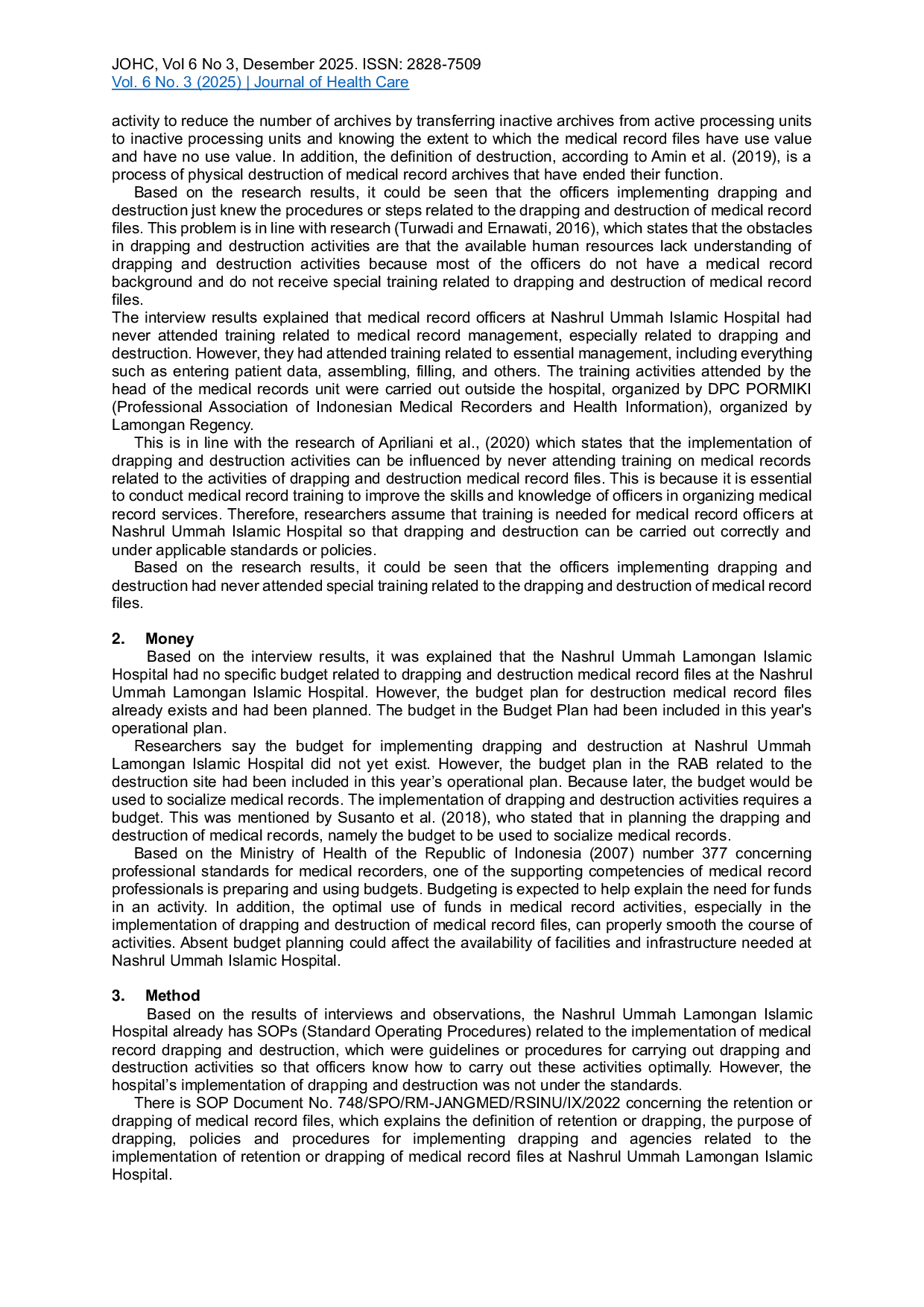 Journal of Health CareJournal of Health CarePelaksanaan drapping dan pemusnahan berkas rekam medis di Rumah Sakit Islam Nashrul Ummah Lamongan bertujuan untuk mengurangi beban penyimpanan, mempermudah pencarian berkas, mengurangi beban kerja petugas, mencegah kesalahan pengarsipan, serta memastikan pengawasan dan pemeliharaan berkas rekam medis yang aktif dan bermanfaat secara efisien. Penelitian ini menggunakan desain kualitatif dengan pendekatan deskriptif. Pengumpulan data dilakukan melalui wawancara, observasi, dan dokumentasi, melibatkan informan kunci seperti kepala unit rekam medis, petugas penyimpanan dan distribusi, serta petugas registrasi yang dipilih melalui purposive sampling. Analisis data dilakukan melalui reduksi data, penyajian data, dan penarikan kesimpulan. Hasil menunjukkan beberapa aspek pelaksanaan. Dari aspek tenaga (man), hanya dua petugas yang memenuhi kualifikasi pendidikan dalam pengelolaan drapping dan pemusnahan berkas rekam medis, menunjukkan kurangnya pengetahuan dan pelatihan terhadap langkah-langkah prosedural. Secara finansial (money), terdapat rencana anggaran untuk kegiatan ini. Namun dari aspek metode (method), meskipun Prosedur Operasional Standar (SOP) tersedia, penerapannya tidak konsisten sesuai kebijakan yang ditetapkan. Secara mekanis (machine), peralatan seperti mesin penghancur dan pemindai khusus tersedia. Dari aspek material, meskipun rak penyimpanan berkas rekam medis tersedia, tidak terdapat rak khusus untuk berkas tidak aktif. Dokumentasi terkait pemusnahan berkas rekam medis juga tidak memiliki bukti yang memadai. Untuk meningkatkan kondisi ini, disarankan agar manajemen rumah sakit memprioritaskan pelatihan bagi petugas yang terlibat dalam drapping dan pemusnahan berkas rekam medis atau melakukan penelitian dan evaluasi lebih lanjut. Pendekatan ini bertujuan untuk memastikan kegiatan sesuai dengan SOP, meningkatkan efisiensi, serta kepatuhan terhadap protokol yang ditetapkan.