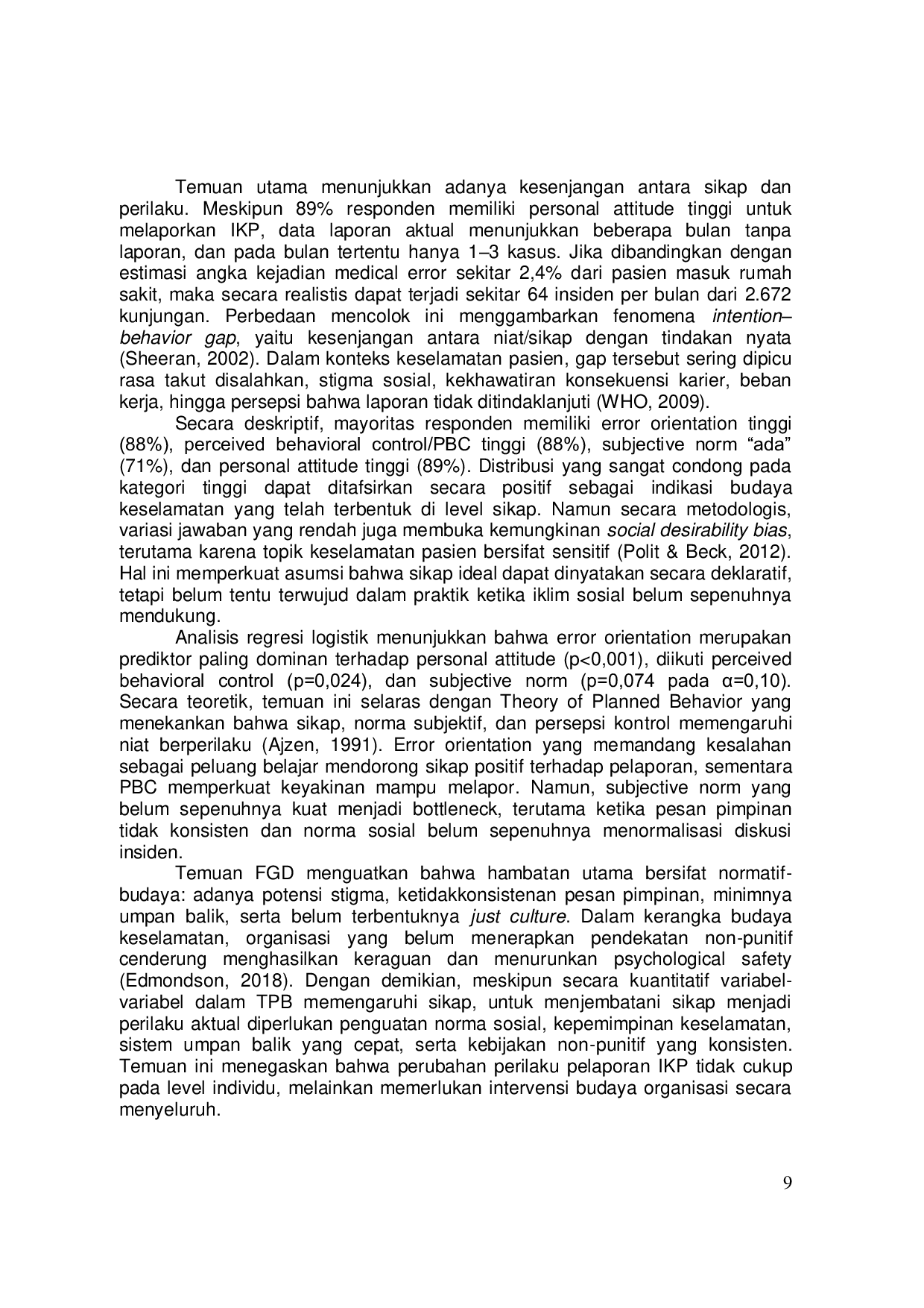 Penelitian ini menyimpulkan bahwa meskipun personal attitude karyawan untuk melaporkan Insiden Keselamatan Pasien (IKP) berada pada kategori tinggi (89%), pelaporan aktual masih sangat rendah dibandingkan dengan angka realistis rata-rata kunjungan pasien.Analisis regresi menunjukkan bahwa error orientation merupakan faktor paling dominan yang memengaruhi personal attitude, diikuti perceived behavioural control dan subjective norm.Namun, subjective norm menjadi titik lemah yang perlu diprioritaskan karena belum sepenuhnya kuat membentuk dorongan sosial yang konsisten.Ditemukan pula adanya kesenjangan antara sikap yang tinggi dan perilaku pelaporan yang rendah, yang dipengaruhi oleh faktor sosial-budaya organisasi seperti ketidakkonsistenan dukungan atasan, kekhawatiran stigma, minimnya umpan balik, dan belum terbentuknya budaya diskusi insiden yang rutin, sehingga menurunkan rasa aman psikologis dan membuat staf cenderung tidak melapor secara formal.