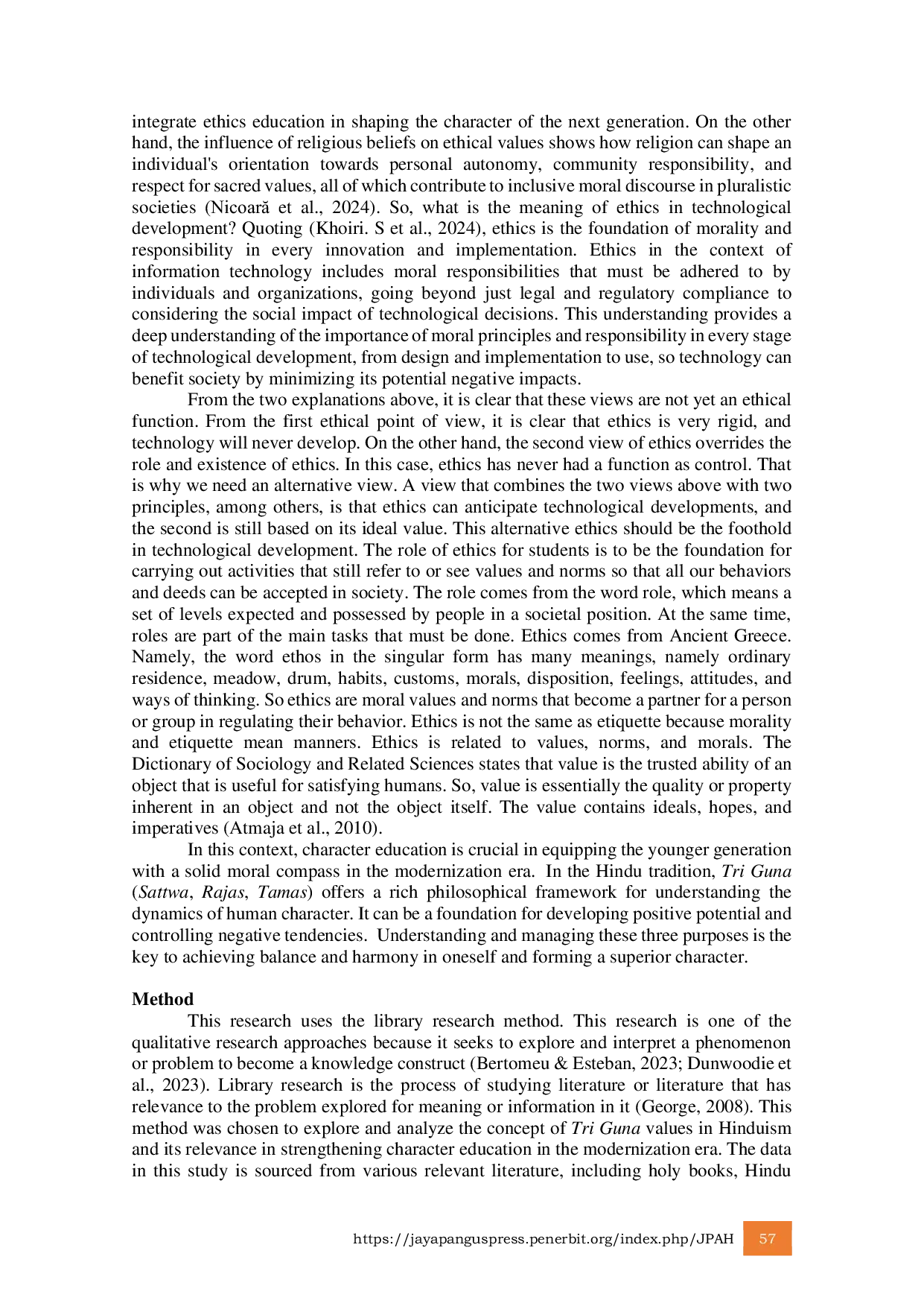 Berdasarkan analisis literatur yang dilakukan, penelitian ini menyimpulkan bahwa konsep Tri Guna (Sattwa, Rajas, Tamas) dalam Hindu memiliki relevansi kuat dan dapat menjadi landasan filosofis yang efektif untuk memperkuat pendidikan karakter di era modernisasi.Temuan penelitian menunjukkan pemahaman mendalam tentang tiga sifat dasar manusia, yaitu Sattwa sebagai perwakilan kebaikan dan kejernihan, Rajas sebagai dinamika dan gairah, serta Tamas sebagai kegelapan dan kemalasan.Hal ini memberikan kerangka untuk memahami dan membentuk karakter manusia dalam menghadapi tantangan modern, seperti potensi degradasi moral dan individualisme.Pengelolaan yang seimbang dari Tri Guna dengan memprioritaskan pengembangan sifat Sattwa, mengarahkan Rajas ke arah yang produktif dan etis, serta mengendalikan atau meminimalkan pengaruh Tamas terbukti menjadi kunci untuk membentuk individu yang memiliki integritas, adaptif, dan mampu menjaga harmoni internal dan sosial.Nilai-nilai Tri Guna tidak hanya menawarkan panduan untuk pengembangan diri pribadi, tetapi juga berkontribusi pada pembentukan karakter unggul yang dibutuhkan oleh masyarakat modern, sejalan dengan tujuan pendidikan karakter holistik yang berbasis nilai-nilai luhur.
