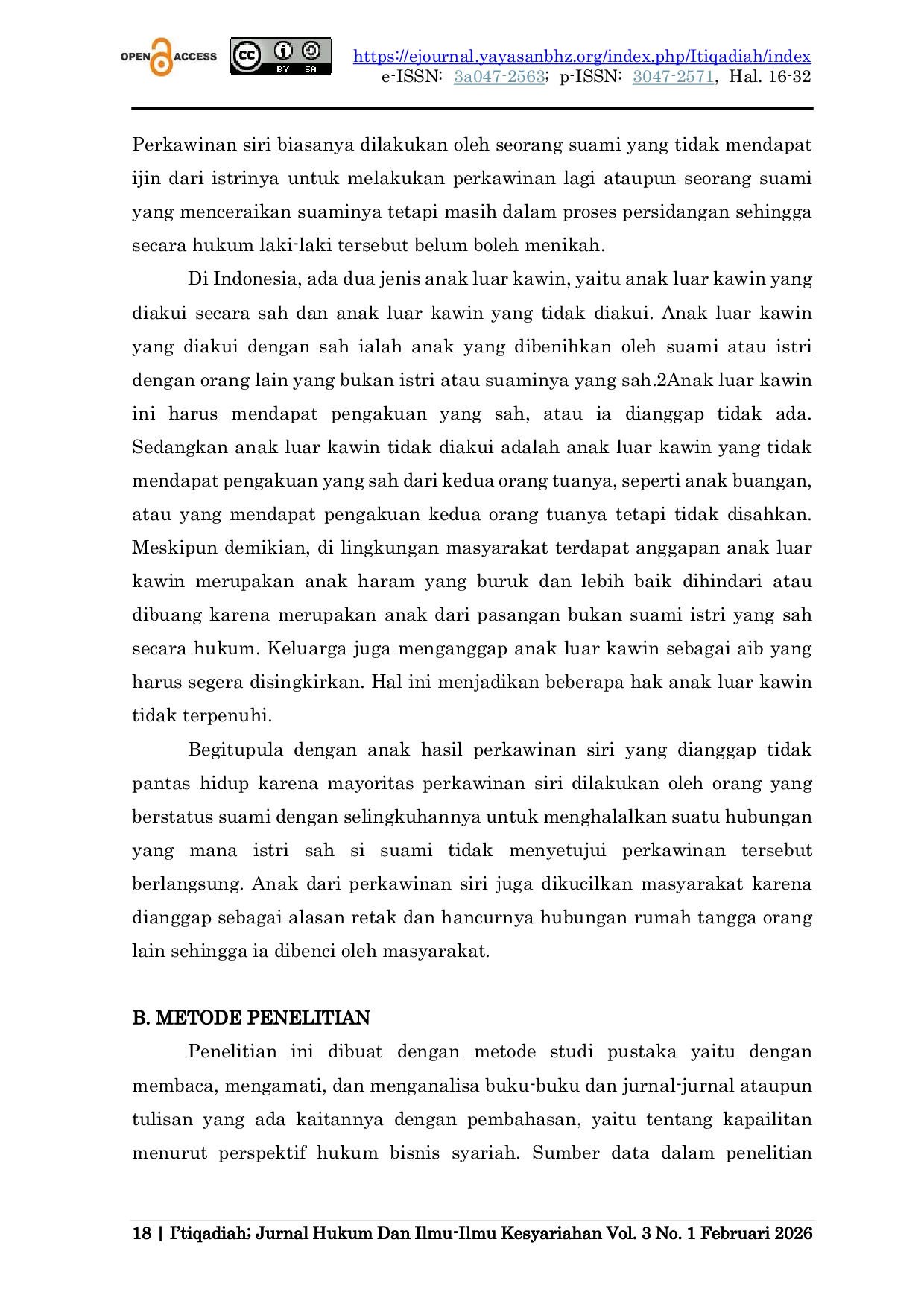 I’tiqadiah: Jurnal Hukum dan Ilmu-ilmu KesyariahanI’tiqadiah: Jurnal Hukum dan Ilmu-ilmu KesyariahanPerkembangan zaman modern dan globalisasi telah meningkatkan berbagai bentuk interaksi sosial. Interaksi tersebut bervariasi, mulai dari pergaulan bebas hingga praktik perkawinan tidak tercatat yang dilakukan untuk menutupi aib. Status anak yang lahir dari perkawinan tidak tercatat menjadi tidak jelas di tengah masyarakat, apakah mereka dianggap sebagai anak sah atau tidak, khususnya dalam hal hak waris. Di Indonesia berlaku tiga sistem hukum waris, yang masing-masing memiliki kelebihan, kekurangan, serta tujuan yang berbeda. Penelitian ini bertujuan untuk mengungkapkan status anak yang lahir dari perkawinan tidak tercatat berdasarkan hukum positif Indonesia serta menurut hukum Islam. Penelitian ini merupakan penelitian hukum dengan pendekatan perundang-undangan, yaitu dengan menelaah peraturan perundang-undangan yang berkaitan dengan warisan dalam perkawinan tidak tercatat, serta pendekatan komparatif dengan membandingkan dua sistem hukum waris yang berlaku di Indonesia, yaitu hukum perdata dan hukum Islam. Anak yang lahir dari perkawinan tidak tercatat memiliki kedudukan yang sama dengan anak sah menurut hukum Indonesia. Namun demikian, terdapat dua hal yang membedakan, yaitu dalam hal identitas dan pewarisan. Dalam aspek waris, anak dari perkawinan tidak tercatat memiliki kedudukan dan bagian waris yang sama dengan anak sah, dengan syarat anak tersebut telah disahkan. Sementara itu, dalam hukum Islam, anak yang lahir dari perkawinan tidak tercatat dan perkawinan tercatat memiliki kedudukan yang sama meskipun belum disahkan secara hukum negara. Dalam kedua perspektif tersebut, perkawinan seharusnya dicatat dan memperoleh akta resmi, jika tidak, anak yang dilahirkan dikategorikan sebagai anak luar perkawinan. Dengan demikian, tanpa pencatatan identitas anak, anak tersebut dianggap sebagai anak di luar perkawinan.