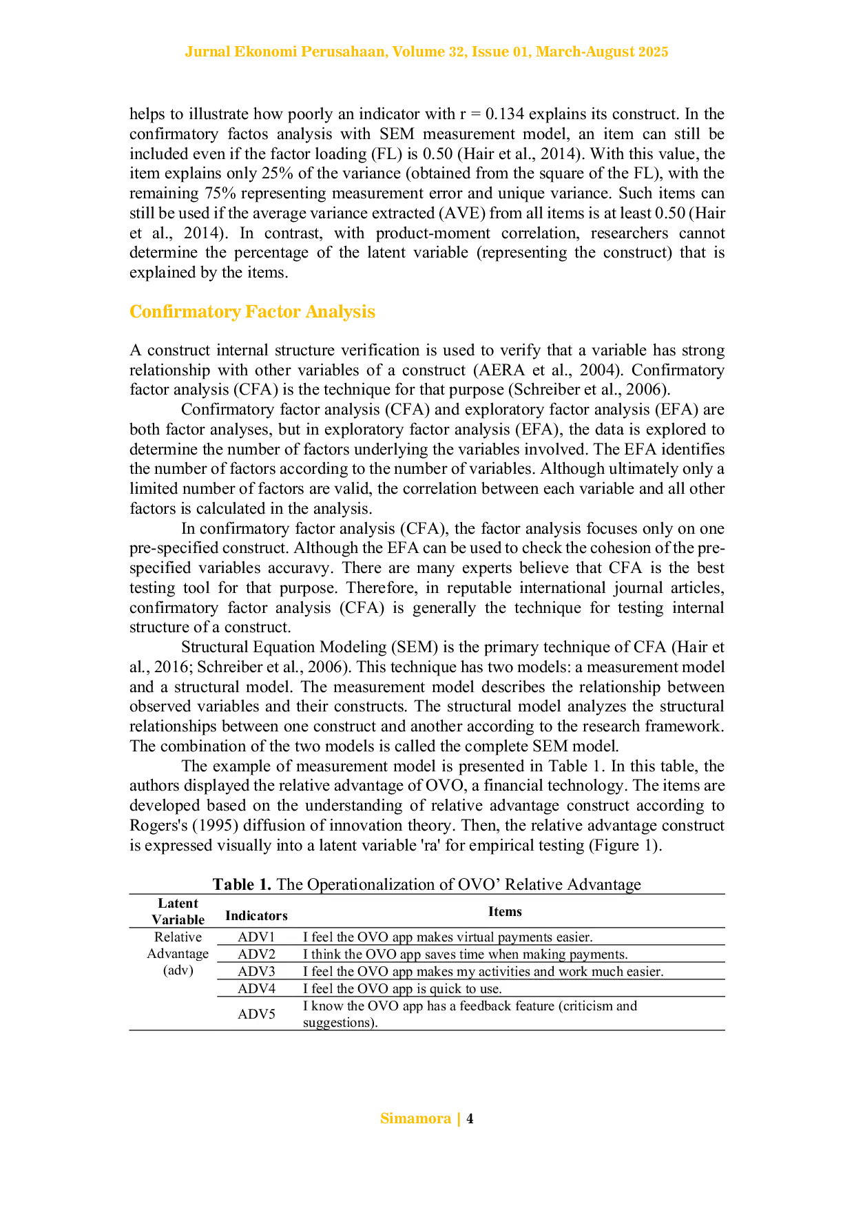 Jurnal Ekonomi PerusahaanJurnal Ekonomi PerusahaanTeknik product-moment correlation adalah metode populer di kalangan akademisi untuk memverifikasi struktur internal sebuah konstruk. Meskipun teknik ini banyak digunakan oleh mahasiswa dan telah disertakan dalam buku-buku teks yang tersebar luas, penulis berpendapat bahwa teknik ini memiliki kelemahan mendasar. Penelitian ini bertujuan untuk menjelaskan kelemahan-kelemahan dari product-moment correlation dalam memverifikasi struktur internal sebuah konstruk multivariabel dan merekomendasikan teknik yang lebih tepat untuk tujuan tersebut. Secara khusus, tujuan dari artikel ini adalah: (1) menjelaskan pemahaman tentang verifikasi struktur internal konstruk, (2) membahas keterbatasan product-moment correlation dalam memverifikasi validitas struktur internal konstruk, dan (3) merekomendasikan teknik yang tepat untuk memverifikasi validitas struktur internal konstruk.