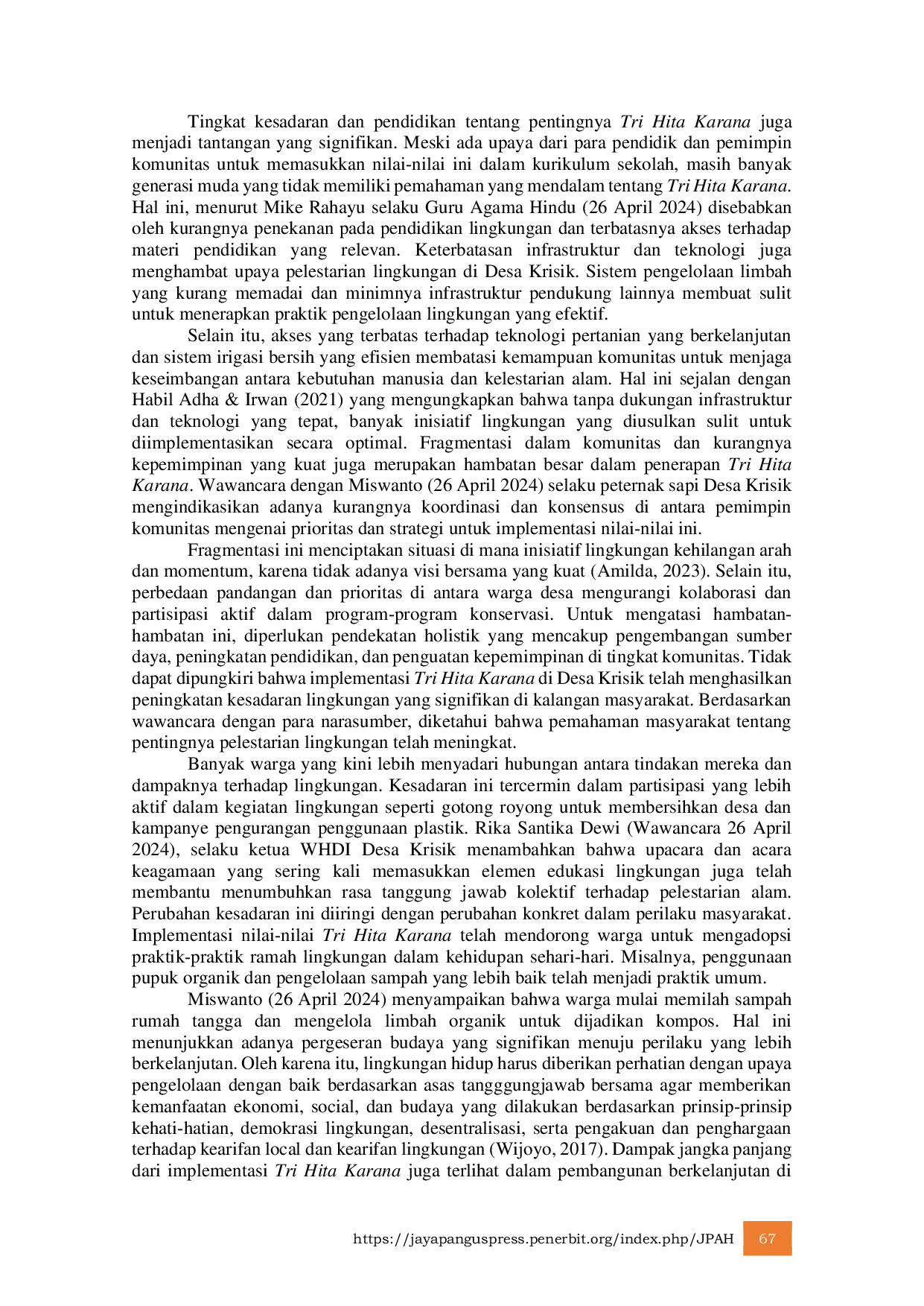 Jurnal Penelitian Agama HinduJurnal Penelitian Agama HinduKesadaran akan pentingnya lingkungan hidup menjadi tantangan bagi banyak komunitas di Indonesia, termasuk masyarakat Hindu di Desa Krisik, Kecamatan Gandusari, Kabupaten Blitar. Konsep Tri Hita Karana, yang menekankan harmoni antara manusia, alam, dan Tuhan, menawarkan pendekatan holistik dalam pendidikan lingkungan hidup. Penelitian ini bertujuan untuk mengeksplorasi implementasi Tri Hita Karana dalam pendidikan lingkungan hidup dan bagaimana kolaborasi masyarakat dapat memperkuat harmoni tersebut. Menggunakan metode kualitatif dengan pendekatan studi kasus, data dikumpulkan melalui wawancara mendalam dengan tokoh masyarakat, guru, dan anggota komunitas, serta observasi partisipatif dan analisis dokumen. Hasil penelitian menunjukkan bahwa penerapan Tri Hita Karana dalam pendidikan lingkungan hidup di Desa Krisik telah secara signifikan meningkatkan kesadaran dan keterlibatan masyarakat dalam pelestarian lingkungan. Praktik-praktik seperti pengelolaan sampah, penghijauan, dan upacara keagamaan yang menghormati alam menjadi bagian integral dari kehidupan sehari-hari masyarakat. Kolaborasi antara sekolah, pemerintah desa, dan masyarakat lokal terbukti efektif dalam mendukung inisiatif lingkungan yang berkelanjutan. Selain itu, nilai-nilai Tri Hita Karana membantu masyarakat mengembangkan pendekatan yang lebih berkelanjutan terhadap lingkungan, memperkuat ikatan sosial dan spiritual dalam komunitas. Penelitian ini menyimpulkan bahwa pendekatan berbasis kearifan lokal seperti Tri Hita Karana dapat menjadi model efektif dalam pendidikan lingkungan hidup, memberikan kontribusi penting bagi pengembangan kebijakan pendidikan lingkungan yang berkelanjutan dan berbasis budaya lokal.