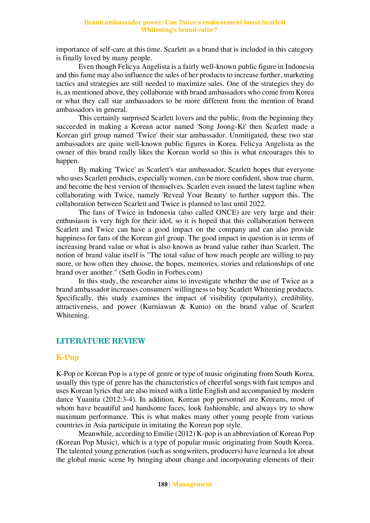- Brand ambassador power: Can Twice's endorsement boost Scarlett Whitening's brand value? | Jurnal... doi.org/10.46806/jep.v31i2.1392Brand ambassador power Can Twices endorsement boost Scarlett Whitenings brand value Jurnal doi 10 46806 jep v31i2 1392