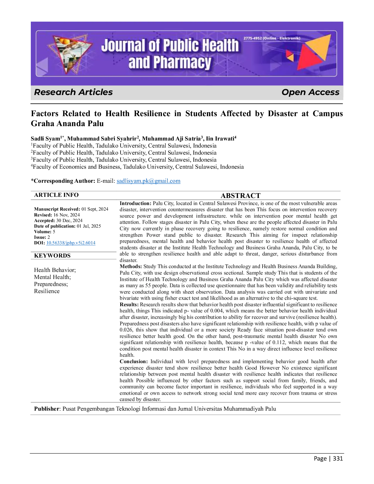 Journal of Public Health and PharmacyJournal of Public Health and PharmacyIndonesia adalah salah satu negara yang memiliki wilayah yang rentan terhadap bencana, termasuk gempa bumi dan tsunami. Wilayah Indonesia terletak di antara tiga lempeng tektonik, yaitu lempeng Pasifik, lempeng Eurasia, dan lempeng Australia-Indes. Kondisi ini membuat Indonesia rentan terhadap gempa bumi, tsunami, letusan gunung berapi, dan jenis bencana geologi lainnya. Ancaman bahaya gempa bumi tersebar hampir di seluruh wilayah Indonesia, baik skala kecil hingga skala besar. Salah satu wilayah yang rentan terhadap bencana adalah Kota Palu, Provinsi Sulawesi Tengah. Pada tanggal 28 September 2018 pukul 18.02, terjadi gempa bumi dan tsunami di Kota Palu. Data dari BNPB pada tanggal 7 November 2018 menunjukkan bahwa korban meninggal mencapai 2.096 orang, jumlah orang yang hilang adalah 1.373 orang, luka-luka berat dan dirawat di rumah sakit sebanyak 4.438 orang, luka ringan dan dirawat jalan sebanyak 83.122 orang, serta pengungsi sebanyak 173.553 orang. Fasilitas pelayanan kesehatan yang terdampak meliputi 1 rumah sakit, 50 puskesmas, 18 poskesdes, dan 5 puskesmas pembantu dengan tingkat kerusakan 12 unit rusak berat, 20 unit rusak sedang, dan 42 unit rusak ringan. Kerusakan infrastruktur meliputi jalan, rumah penduduk, gedung perkantoran, hotel, dan sekolah.