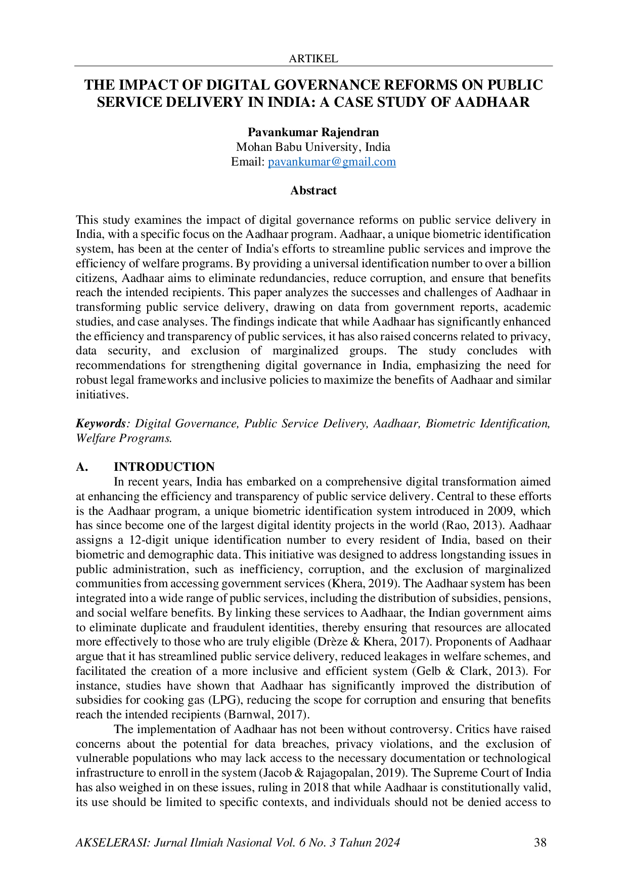 AKSELERASI: Jurnal Ilmiah NasionalAKSELERASI: Jurnal Ilmiah NasionalPenelitian ini mengkaji dampak reformasi tata kelola digital terhadap pelayanan publik di India, dengan fokus khusus pada program Aadhaar. Aadhaar, sistem identifikasi biometrik unik, berada di pusat upaya India dalam menyederhanakan pelayanan publik dan meningkatkan efisiensi program kesejahteraan. Dengan memberikan nomor identifikasi universal kepada lebih dari satu miliar warga, Aadhaar bertujuan untuk menghilangkan redundansi, mengurangi korupsi, dan memastikan manfaat mencapai penerima yang dituju. Studi ini menganalisis keberhasilan dan tantangan Aadhaar dalam mentransformasi pelayanan publik, berdasarkan data dari laporan pemerintah, kajian akademik, dan analisis kasus. Temuan menunjukkan bahwa meskipun Aadhaar telah meningkatkan efisiensi dan transparansi pelayanan publik secara signifikan, sistem ini juga menimbulkan kekhawatiran terkait privasi, keamanan data, dan pengecualian terhadap kelompok-kelompok marginal. Studi ini menyimpulkan dengan rekomendasi untuk memperkuat tata kelola digital di India, dengan menekankan perlunya kerangka hukum yang kuat dan kebijakan inklusif guna memaksimalkan manfaat Aadhaar dan inisiatif serupa.