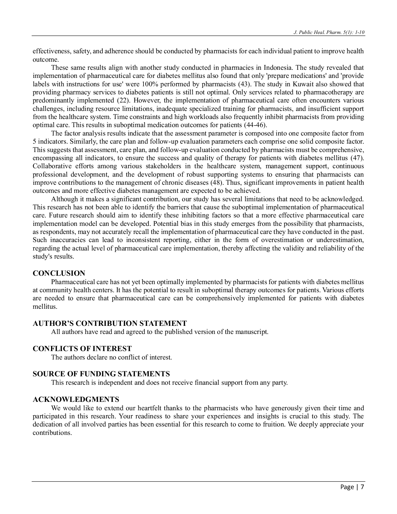 Journal of Public Health and PharmacyJournal of Public Health and PharmacyDiabetes melitus merupakan epidemi global yang terus meningkat, termasuk di Indonesia, serta berdampak signifikan terhadap kesehatan masyarakat. Peran apoteker dalam memberikan asuhan kefarmasian bagi pasien diabetes di puskesmas sangat penting, namun tantangan dalam pelaksanaannya masih ada. Studi ini bertujuan untuk mengeksplorasi pengalaman apoteker dalam melaksanakan asuhan kefarmasian bagi pasien diabetes di puskesmas di Indonesia. Penelitian potong lintang ini dilakukan di puskesmas di Provinsi Kalimantan Selatan, Indonesia. Apoteker yang bekerja di puskesmas direkrut antara Oktober dan Desember 2023. Survei dibagikan dalam format cetak dan daring (Google Form). Kuesioner yang digunakan difokuskan pada pemberian parameter penilaian, rencana perawatan, dan tindak lanjut terkait pengobatan pasien diabetes. Tingkat respons sebesar 60,3% (n=143) diperoleh dari apoteker yang terlibat dalam survei. Mengenai parameter penilaian, indikator penilaian kepercayaan pasien merupakan yang paling dominan dilaksanakan oleh apoteker (93,7%) dibandingkan indikator lainnya. Dalam aspek rencana perawatan, pemberian informasi mengenai indikasi obat merupakan indikator yang paling dominan dilaksanakan (82,9%). Sementara itu, untuk parameter tindak lanjut, indikator tindak lanjut kepatuhan obat merupakan yang paling dominan dilaksanakan oleh apoteker (79,1%). Analisis faktor mengungkapkan bahwa penilaian, rencana perawatan, dan evaluasi tindak lanjut masing-masing membentuk satu komposit.