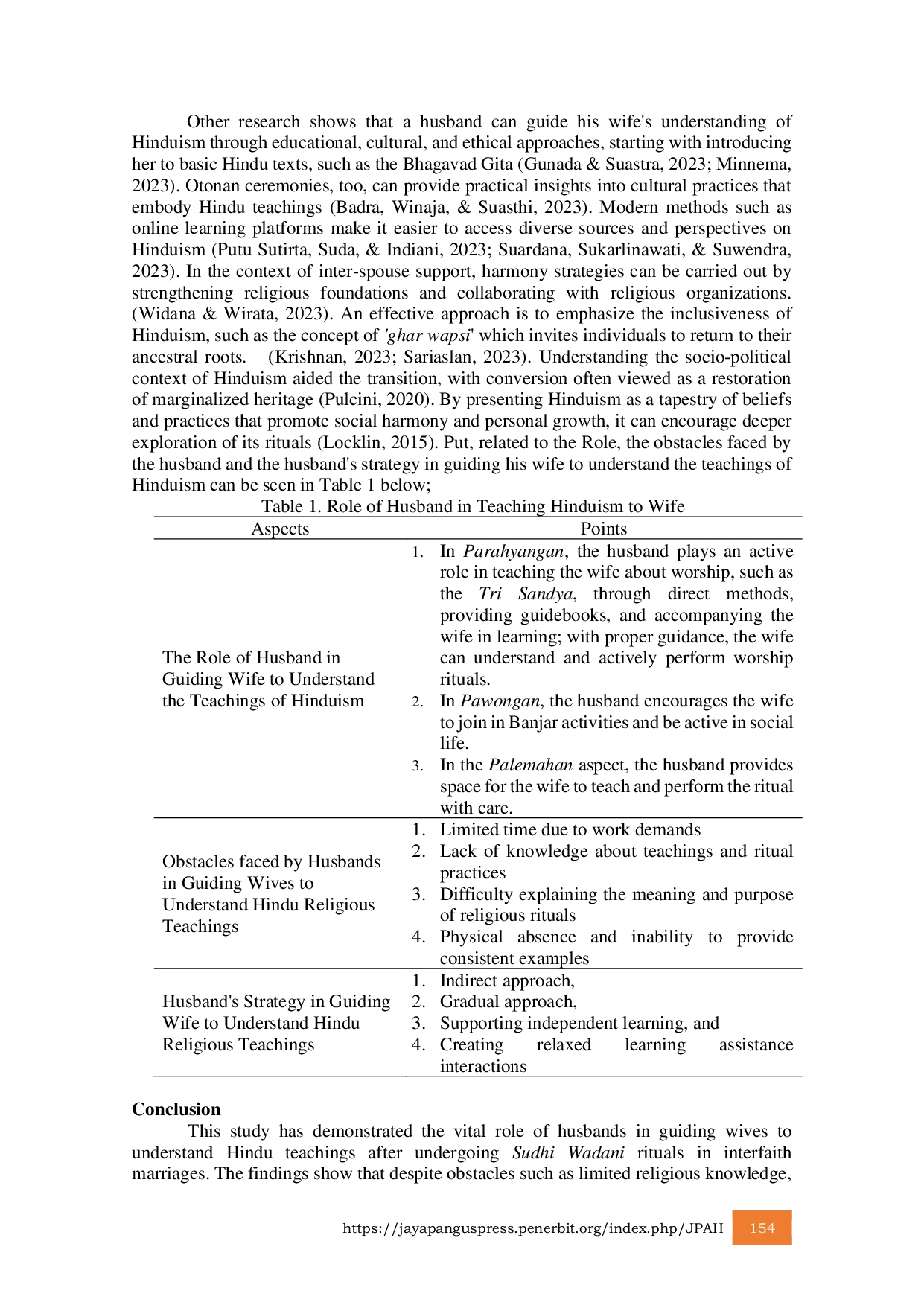Jurnal Penelitian Agama HinduJurnal Penelitian Agama HinduPernikahan beda agama di Indonesia merupakan isu kompleks yang melibatkan dilema hukum, sosial, dan agama. Pernikahan harus sah secara agama dan hukum negara, yang mensyaratkan kedua mempelai seiman untuk dapat diakui sah secara agama. Ketentuan ini menimbulkan kontroversi dan ketidakadilan, terutama terkait kebebasan beragama dan hak asasi manusia dalam masyarakat multikultural. Tujuan penelitian ini berfokus pada peran suami dalam memberikan pemahaman ajaran agama Hindu kepada istri yang telah menjalani Sudhi Wadani yang sebelumnya menganut agama lain, khususnya dalam konteks pernikahan beda agama. Penelitian ini menggunakan metode kualitatif dengan pendekatan fenomenologi, dengan teknik indepth interview dan observasi partisipatif. Penelitian ini dilakukan di Kota Palu pada tahun 2024 dengan 13 informan suami. Hasil penelitian menunjukkan bahwa suami memegang peran sentral dalam membimbing istri untuk memahami ajaran agama Hindu, yang diwujudkan melalui pengajaran langsung, mendampingi dalam aktivitas keagamaan, dan menjadi teladan. Kendala yang dihadapi suami meliputi keterbatasan pengetahuan agama, minimnya waktu akibat kesibukan pekerjaan, dan sensitivitas istri. Strategi yang diterapkan suami untuk mengatasi kendala ini meliputi mengajak istri secara tidak langsung untuk terlibat dalam kegiatan keagamaan, komunikasi yang sabar, dan pemanfaatan komunitas keagamaan sebagai sarana pembelajaran. Penelitian ini menyimpulkan bahwa peran suami dalam membimbing istri memahami ajaran agama Hindu dalam pernikahan lintas agama sangat penting, dan memerlukan upaya yang konsisten, fleksibel, dan berbasis praktik nyata. Rekomendasi praktis bagi pasangan berbeda agama dan lembaga terkait untuk memperkuat dukungan terhadap suami Hindu dari istri yang telah menjalani Sudhi Wadani pada pernikahan lintas agama.