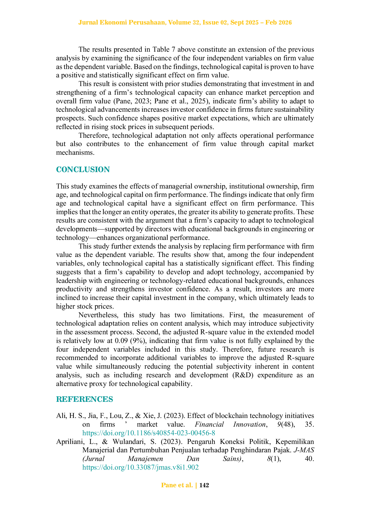 Penelitian ini menemukan bahwa hanya umur perusahaan dan modal teknologi yang memiliki pengaruh signifikan terhadap kinerja perusahaan.Selain itu, penelitian ini juga menunjukkan bahwa hanya modal teknologi yang memiliki pengaruh signifikan terhadap nilai perusahaan.Temuan ini mengindikasikan bahwa kemampuan perusahaan untuk beradaptasi dan mengembangkan kemampuan teknologi tidak hanya meningkatkan profitabilitas tetapi juga meningkatkan harga sahamnya di pasar modal.Penelitian selanjutnya dapat mempertimbangkan variabel tambahan untuk meningkatkan kemampuan model dalam menjelaskan nilai perusahaan.