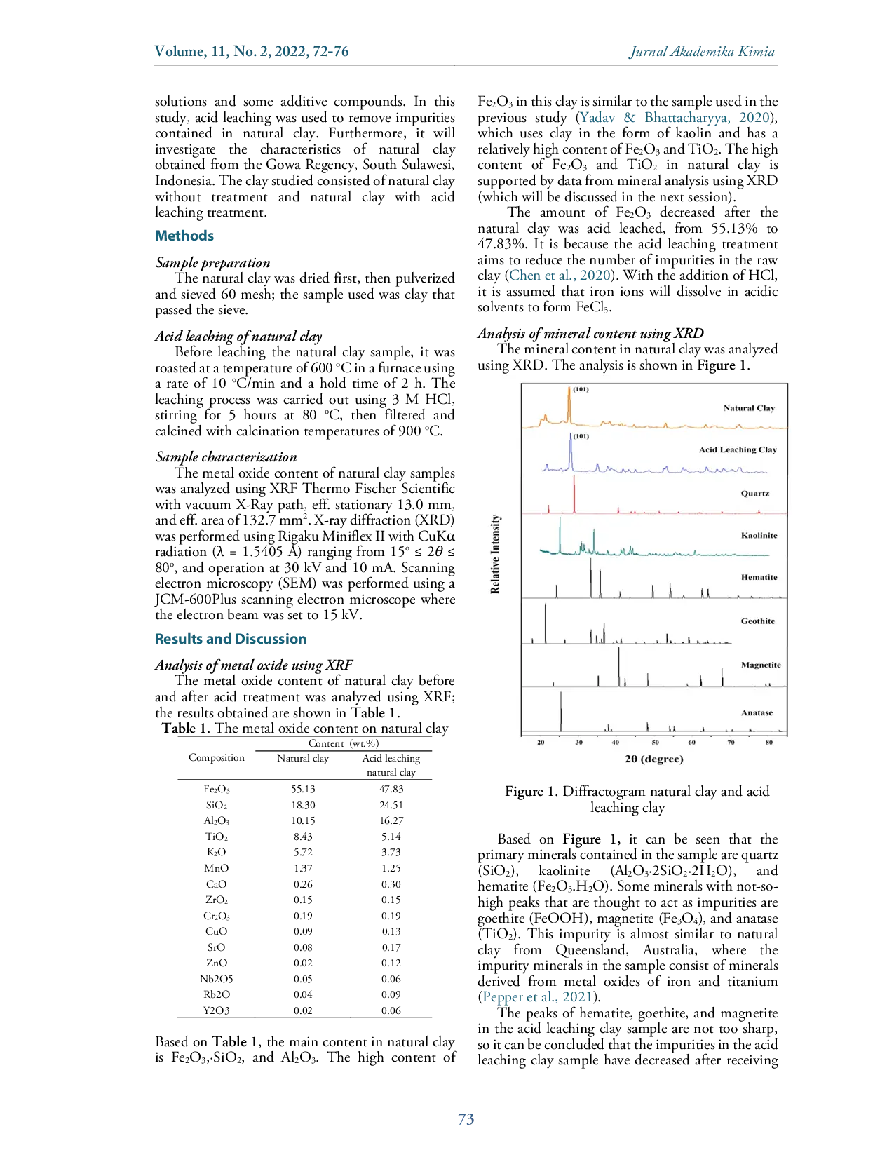 Hasil menunjukkan bahwa kandungan oksida logam utama dalam liat alami adalah Fe2O3, Al2O3, dan SiO2, kandungan Fe2O3 berkurang setelah liat mentah diperlakukan dengan asam (hasil analisis XRF).Kandungan mineral utama dalam sampel adalah kuarsa, kaolinit, dan hematit.Morfologi sampel terlihat berbeda setelah diberi perlakuan asam.sampel liat alami yang dileach asam menunjukkan morfologi berpori, sedangkan liat alami tanpa leaching asam menunjukkan morfologi dalam bentuk gumpalan.Analisis EDX menunjukkan bahwa jumlah impuritas berkurang setelah diberi perlakuan asam.