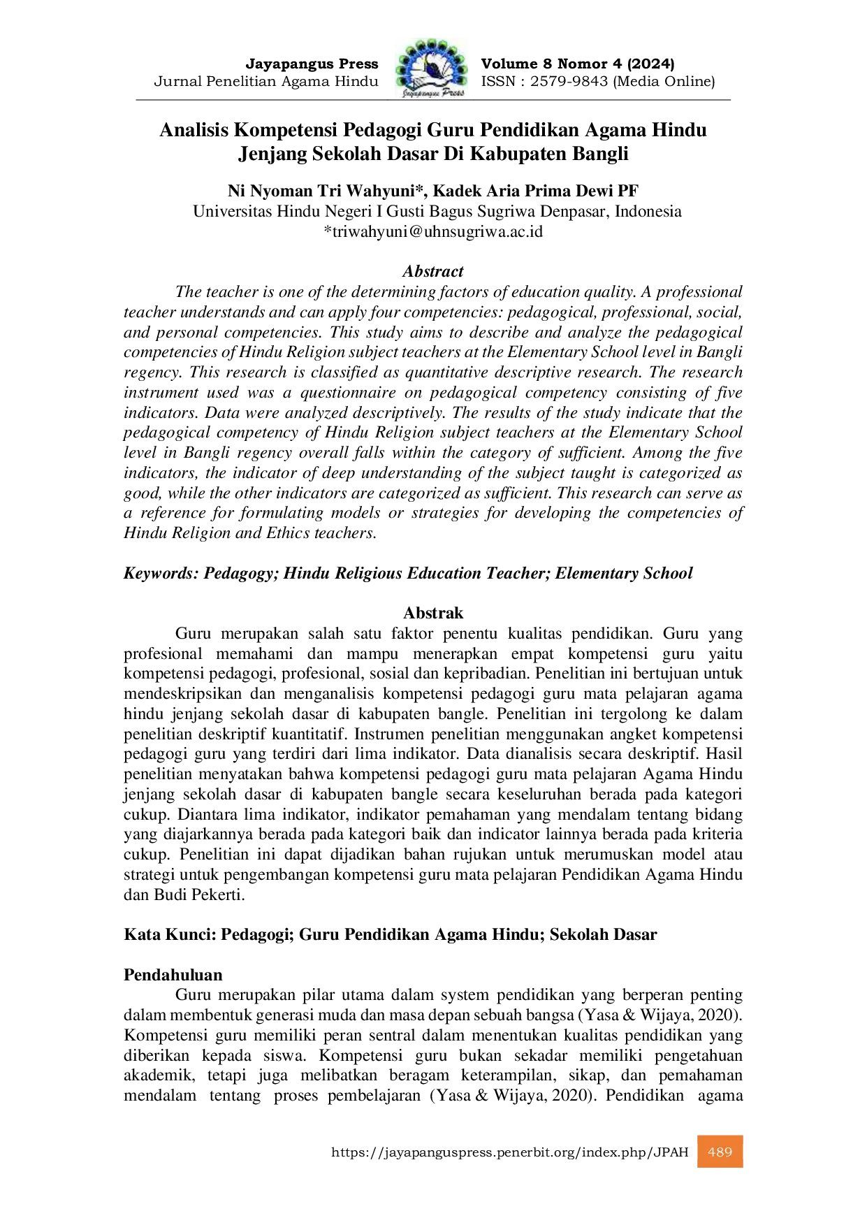 Jurnal Penelitian Agama HinduJurnal Penelitian Agama HinduGuru merupakan salah satu faktor penentu kualitas pendidikan. Guru yang profesional memahami dan mampu menerapkan empat kompetensi guru yaitu kompetensi pedagogi, profesional, sosial dan kepribadian. Penelitian ini bertujuan untuk mendeskripsikan dan menganalisis kompetensi pedagogi guru mata pelajaran agama hindu jenjang sekolah dasar di kabupaten bangle. Penelitian ini tergolong ke dalam penelitian deskriptif kuantitatif. Instrumen penelitian menggunakan angket kompetensi pedagogi guru yang terdiri dari lima indikator. Data dianalisis secara deskriptif. Hasil penelitian menyatakan bahwa kompetensi pedagogi guru mata pelajaran Agama Hindu jenjang sekolah dasar di kabupaten bangle secara keseluruhan berada pada kategori cukup. Diantara lima indikator, indikator pemahaman yang mendalam tentang bidang yang diajarkannya berada pada kategori baik dan indicator lainnya berada pada kriteria cukup. Penelitian ini dapat dijadikan bahan rujukan untuk merumuskan model atau strategi untuk pengembangan kompetensi guru mata pelajaran Pendidikan Agama Hindu dan Budi Pekerti.