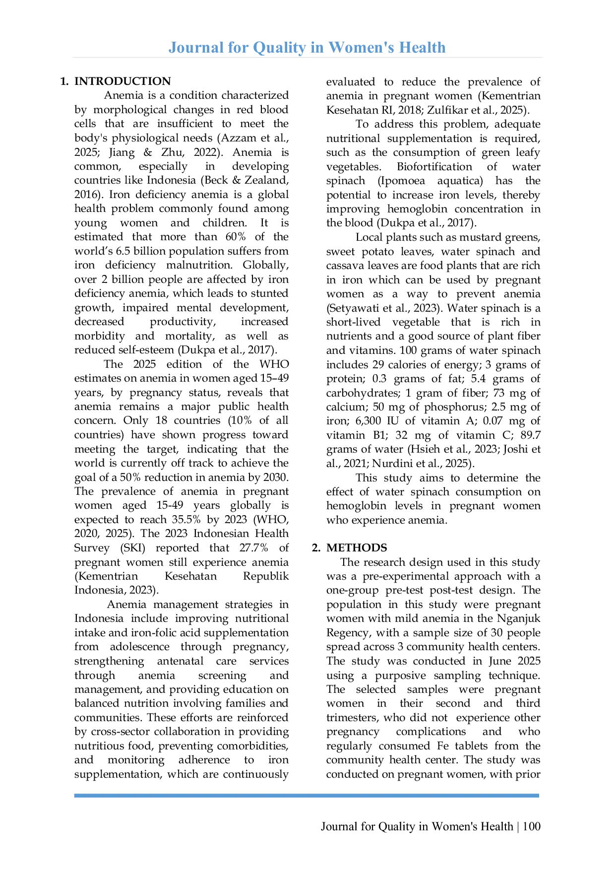 Journal for Quality in Women's HealthJournal for Quality in Women's HealthAnemia adalah kondisi umum pada wanita hamil, terutama disebabkan oleh kekurangan zat besi, dan dapat menyebabkan komplikasi selama kehamilan dan persalinan. Survei Kesehatan Indonesia (SKI) tahun 2023 melaporkan bahwa 27,7% wanita hamil masih mengalami anemia. Intervensi gizi menggunakan sayuran kaya zat besi dan vitamin C, seperti bayam air (Ipomoea aquatica), dapat menjadi strategi alternatif untuk meningkatkan kadar hemoglobin. Penelitian ini bertujuan untuk menentukan efek konsumsi bayam air pada kadar hemoglobin pada wanita hamil.