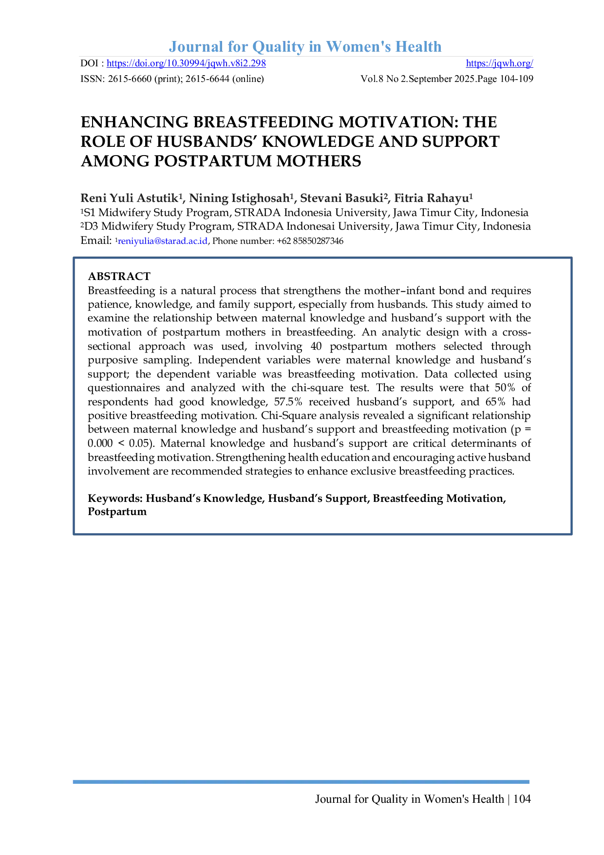 - ENHANCING BREASTFEEDING MOTIVATION: THE ROLE OF HUSBANDS’ KNOWLEDGE AND SUPPORT AMONG POSTPARTUM... doi.org/10.30994/jqwh.v8i2.298ENHANCING BREASTFEEDING MOTIVATION THE ROLE OF HUSBANDSAo KNOWLEDGE AND SUPPORT AMONG POSTPARTUM doi 10 30994 jqwh v8i2 298