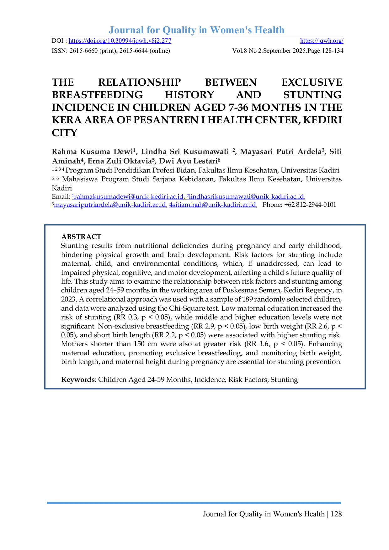 - THE RELATIONSHIP BETWEEN EXCLUSIVE BREASTFEEDING HISTORY AND STUNTING INCIDENCE IN CHILDREN AGED 7-36... doi.org/10.30994/jqwh.v8i2.277THE RELATIONSHIP BETWEEN EXCLUSIVE BREASTFEEDING HISTORY AND STUNTING INCIDENCE IN CHILDREN AGED 7 36 doi 10 30994 jqwh v8i2 277