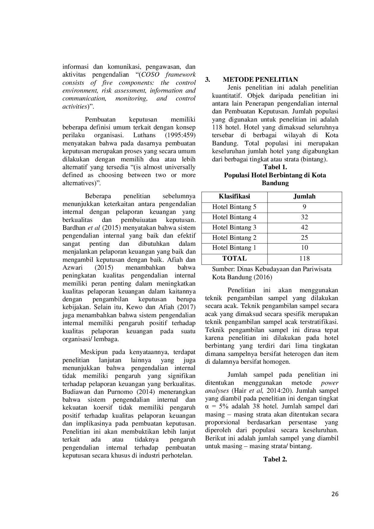 Variabel pengendalian internal dinyatakan berpengaruh terhadap variabel pembuatan keputusan di hotel berbintang Kota Bandung.Hal ini didukung oleh observasi lapangan yang menunjukkan bahwa banyak hotel telah menerapkan pengendalian internal dengan baik, terutama dalam aspek pemahaman akuntan dan staf keuangan terhadap prosedur keamanan dokumen, otorisasi, dan pemisahan fungsi kerja.Selain itu, penggunaan kerangka kerja kontrol internal menunjukkan bahwa industri perhotelan mulai memberi perhatian khusus terhadap risiko yang muncul dalam pelaporan keuangan.