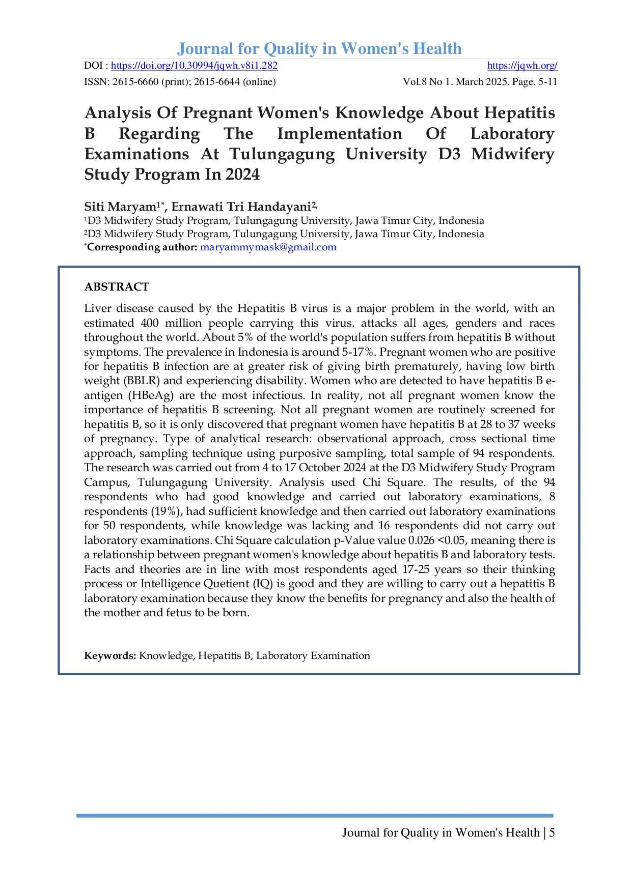 Journal for Quality in Women's HealthJournal for Quality in Women's HealthPenyakit hati yang disebabkan oleh virus Hepatitis B merupakan masalah besar di dunia, dengan diperkirakan 400 juta orang menjadi pembawa virus ini. Virus menyerang semua usia, jenis kelamin, dan ras di seluruh dunia. Sekitar 5% populasi dunia menderita hepatitis B tanpa gejala. Prevalensi di Indonesia berkisar antara 5-17%. Ibu hamil yang positif terinfeksi hepatitis B memiliki risiko lebih tinggi melahirkan secara prematur, bayi dengan berat badan lahir rendah (BBLR), dan mengalami disabilitas. Wanita yang terdeteksi memiliki antigen e-hepatitis B (HBeAg) merupakan yang paling menular. Faktanya, tidak semua ibu hamil mengetahui pentingnya skrining hepatitis B. Tidak semua ibu hamil diperiksa secara rutin untuk hepatitis B, sehingga infeksi baru diketahui pada usia kehamilan 28 hingga 37 minggu. Jenis penelitian analitik dengan pendekatan observasional dan potong lintang, teknik pengambilan sampel menggunakan purposive sampling dengan jumlah sampel 94 responden. Penelitian dilakukan dari tanggal 4 hingga 17 Oktober 2024 di Kampus Program Studi D3 Kebidanan, Universitas Tulungagung. Analisis yang digunakan adalah Chi Square. Hasilnya, dari 94 responden, 8 responden (19%) memiliki pengetahuan baik dan melakukan pemeriksaan laboratorium, 50 responden memiliki pengetahuan cukup dan melakukan pemeriksaan laboratorium, sementara 16 responden memiliki pengetahuan kurang dan tidak melakukan pemeriksaan laboratorium. Nilai p-Value dari uji Chi Square sebesar 0,026 < 0,05, yang berarti terdapat hubungan antara pengetahuan ibu hamil tentang hepatitis B dengan pemeriksaan laboratorium. Fakta dan teori sejalan dengan mayoritas responden berusia 17–25 tahun sehingga proses berpikir atau Kecerdasan Intelektual (IQ) mereka baik, serta bersedia melakukan pemeriksaan laboratorium hepatitis B karena mengetahui manfaatnya bagi kehamilan serta kesehatan ibu dan janin yang akan lahir.