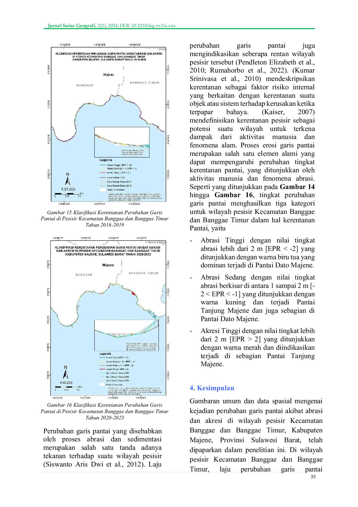 Jurnal Sains GeografiJurnal Sains GeografiStudi perubahan garis pantai merupakan langkah penting dalam memahami dinamika pesisir di Kecamatan Banggae dan Banggae Timur merupakan langkah awal untuk mengurangi risiko erosi pantai serta meminimalkan kerugian sosial, fisik, dan ekonomi. Penelitian ini dilakukan di wilayah pesisir Kecamatan Banggae dan Banggae Timur, Kabupaten Majene, Provinsi Sulawesi Barat dengan memanfaatkan citra satelit Landsat multi-temporal Landsat 8 OLI-TIRS tahun 2013, 2014, 2015, 2016, 2018, 2019, 2020, 2022, dan 2023. Analisis Garis Pantai Perubahan garis pantai ditentukan dengan menggunakan Sistem Analisis Garis Pantai Digital (Digital Shoreline Analysis System, DSAS). Akhir End Point Rate (EPR), Pergerakan Garis Pantai Bersih (NSM) digunakan untuk menghitung laju perubahan garis pantai dan prediksi perubahan garis pantai untuk 9 tahun. Hasil penelitian menunjukkan bahwa pada periode 2013-2023 terjadi abrasi seluas 4,20 Ha dan akresi seluas 1,45 Ha. Pada periode 2016-2019 terjadi abrasi seluas 4,02 dan akresi seluas 3,75 Ha. Pada periode 2020-2023 terjadi abrasi seluas 7,98 Ha dan akresi seluas 24,48 Ha. Secara spasial, wilayah pesisir kecamatan Banggae dan Banggae Timur terjadi perubahan garis pantai akibat abrasi dan akresi.