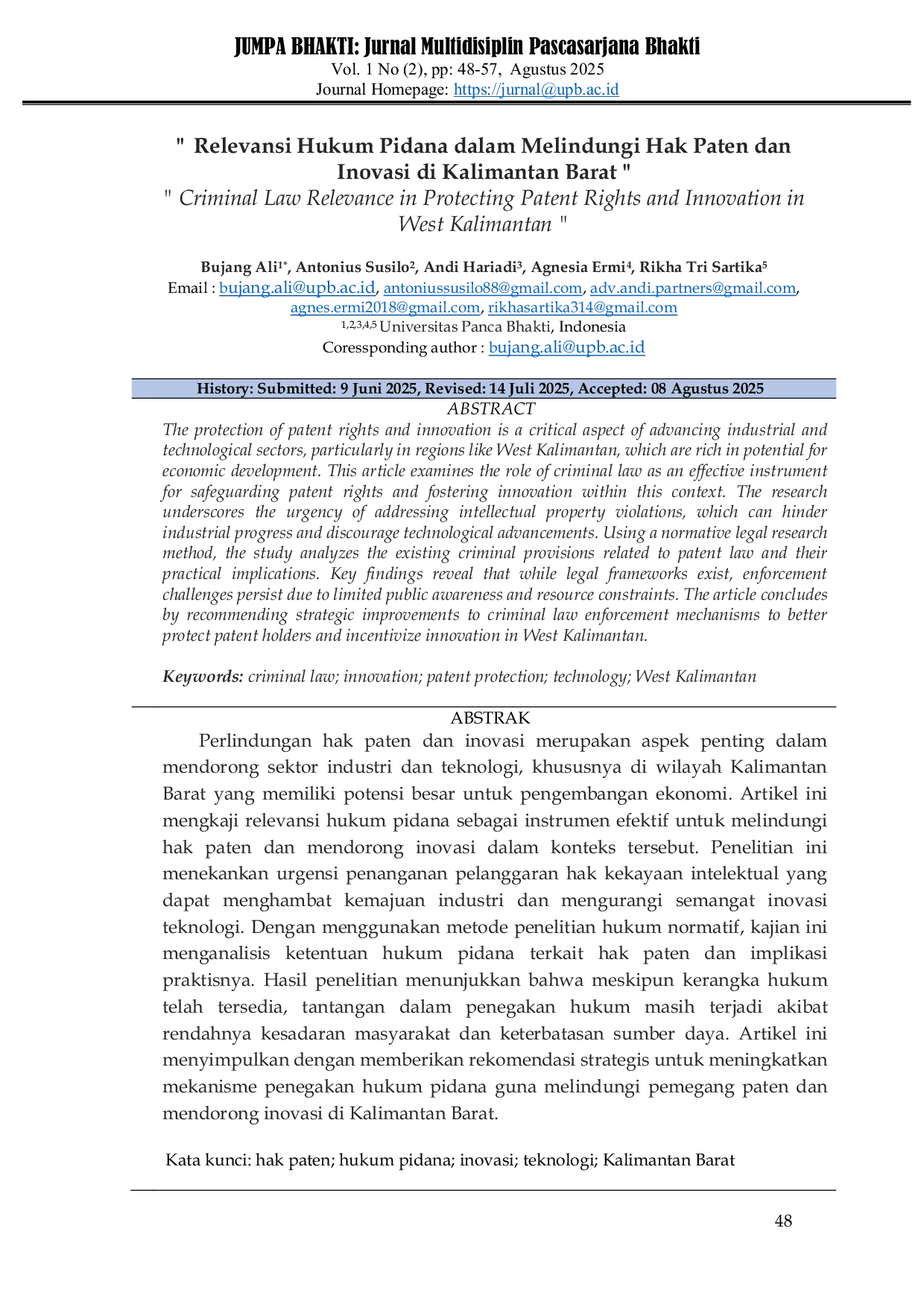 JUMPA BHAKTI : (JURNAL MULTIDISIPLIN PASCASARJANA) BHAKTIJUMPA BHAKTI : (JURNAL MULTIDISIPLIN PASCASARJANA) BHAKTIPerlindungan hak paten dan inovasi merupakan aspek penting dalam mendorong sektor industri dan teknologi, khususnya di wilayah Kalimantan Barat yang memiliki potensi besar untuk pengembangan ekonomi. Artikel ini mengkaji relevansi hukum pidana sebagai instrumen efektif untuk melindungi hak paten dan mendorong inovasi dalam konteks tersebut. Penelitian ini menekankan urgensi penanganan pelanggaran hak kekayaan intelektual yang dapat menghambat kemajuan industri dan mengurangi semangat inovasi teknologi. Dengan menggunakan metode penelitian hukum normatif, kajian ini menganalisis ketentuan hukum pidana terkait hak paten dan implikasi praktisnya. Hasil penelitian menunjukkan bahwa meskipun kerangka hukum telah tersedia, tantangan dalam penegakan hukum masih terjadi akibat rendahnya kesadaran masyarakat dan keterbatasan sumber daya. Artikel ini menyimpulkan dengan memberikan rekomendasi strategis untuk meningkatkan mekanisme penegakan hukum pidana guna melindungi pemegang paten dan mendorong inovasi di Kalimantan Barat.