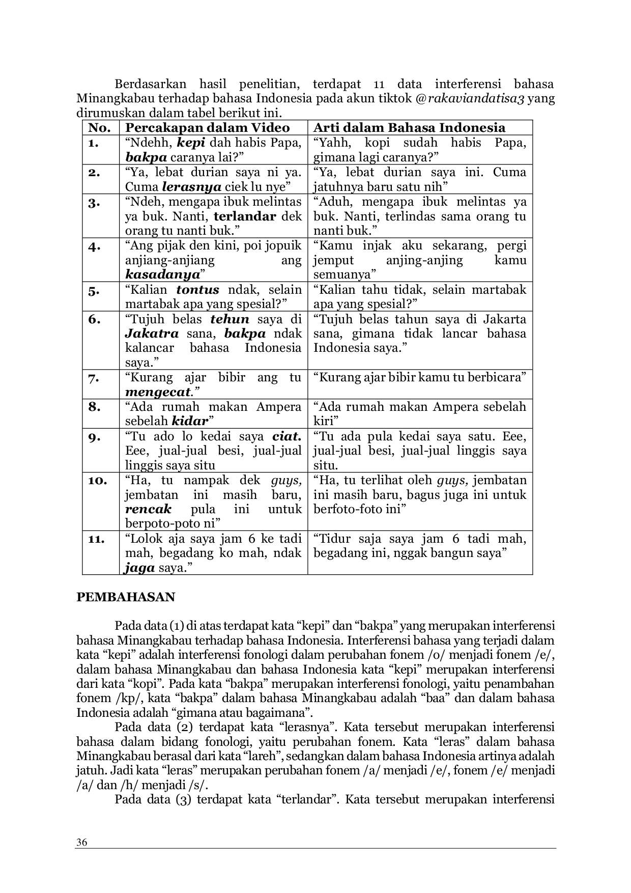 Lintang AksaraLintang AksaraPenelitian ini membahas interferensi bahasa Minangkabau terhadap bahasa Indonesia yang digunakan pada video akun tiktok @rakaviandatisa3. Fenomena interferensi bahasa ini biasanya terjadi pada bidang linguistik yaitu fonologi, morfologi, semantik, sintaksi dan ilmu bahasa lainnya. Penelitian ini menggunakan metode kualitatif deskriptif. Data dalam penelitian ini diperoleh dengan menggunakan metode simak dan catat. Dari hasil analisis pada video tiktok tersebut ditemukan bentuk-bentuk interferensi dalam bidang fonologi dan morfologi. Interferensi fonologi dalam penelitian ini diantaranya yaitu perubahan, pengurangan dan penambahan fonem, sedangkan interferensi morfologi dalam penelitian ini yaitu pada proses pembentukan kata. Hasil penelitian ini mendeskripsikan bahwa terdapat 11 bentuk interferensi bahasa Minangkabau terhadap bahasa Indonesia, diantaranya yaitu 10 bentuk interferensi fonologi dan 1 bentuk interferensi morfologi.