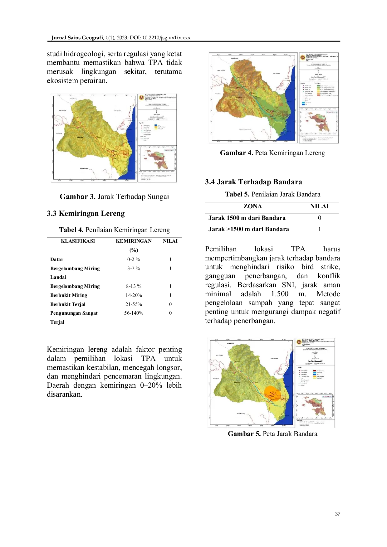 Jurnal Sains GeografiJurnal Sains GeografiDistrik Ransiki merupakan salah satu daerah yang memiliki kondisi geologi yang kompleks dan sangat menarik untuk diteliti. Sesar Ransiki merupakan sesar aktif dan menjadi salah satu faktor utama penentu kesesuaian lahan untuk TPA sampah berdasarkan aspek geologi. Pertambahan jumlah kependudukan Distrik Ransiki Kabupaten Manokwari Selatan mencapai 16.245 jiwa pada tahun 2020. Namun hingga saat ini belum adanya TPA untuk menampung buangan limbah dari masyarakat. Berdasarkan hal itu maka perlu adanya studi kesesuaian lahan untuk menentukan lokasi tempat pembuangan sampah yang sesuai. Metode analisis data yang digunakan dalam penelitian ini menggunakan SNI No. 03-3241-1994. Hasil penelitian ini yaitu tahap regional yang di overlay dari beberapa parameter menghasilkan 4 calon lokasi tempat pembunagan akhir sampah dengan calon lokasi 1 berada pada Kampung Hamawi dengan luas 136,51 Ha, calon lokasi 2 berada pada Kampung Tobou dengan luas 239,69 Ha, calon lokasi 3 berada pada Kampung Sabri dengan luas 413,12 Ha. Calon lokasi 4 berada pada Kampung Sabri dengan luas 101,45 Ha. Hasil tahap penyisih dari pembobotan setiap parameter dimana lokasi 1 memiliki nilai 495, lokasi 2 memiliki nilai 534, lokasi 3 memiliki nilai 543 dan lokasi 4 memiliki nilai 483. Dari hasil tahap penyisih, lokasi yang direkomendasikan yaitu lokasi 3 yang berada pada Kampung Sabri Distrik Ransiki dengan nilai tertinggi 543.