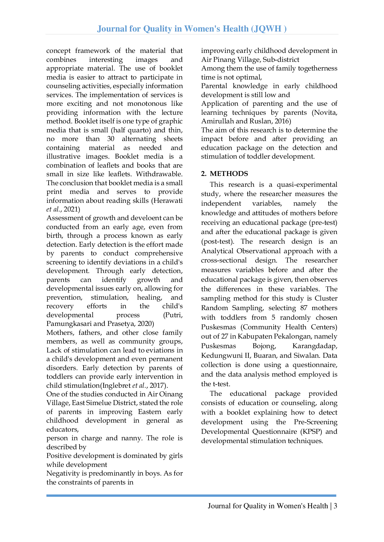 Journal for Quality in Women's HealthJournal for Quality in Women's HealthLatar Belakang: Diperkirakan 52,9 juta anak di bawah usia 5 tahun saat ini hidup dengan gangguan perkembangan di seluruh dunia. Melalui langkah-langkah deteksi dini, orang tua dapat mengetahui masalah tumbuh kembang anak lebih awal, sehingga upaya pencegahan, stimulasi, penyembuhan, dan pemulihan dapat dilakukan. Tujuan dari penelitian ini adalah untuk mengetahui efek sebelum dan setelah paket edukasi deteksi dan stimulasi diberikan. Metode: Jenis penelitian ini adalah kuasi eksperimen dengan pendekatan cross-sectional. Pengambilan sampel menggunakan cluster random sampling dengan total 78 responden dan analisis menggunakan uji-T. Hasil: Hasil penelitian menunjukkan perbedaan yang signifikan secara statistik antara pengetahuan dan sikap ibu yang memiliki balita sebelum dan setelah paket edukasi dengan nilai p 0,001. Analisis: Pemberian paket edukasi dapat meningkatkan pengetahuan tentang deteksi dan stimulasi perkembangan balita. Kesimpulan: Saran bagi tenaga kesehatan, khususnya bidan, adalah dapat memberikan edukasi yang komprehensif dan bekerja sama dalam deteksi dini serta stimulasi perkembangan balita.