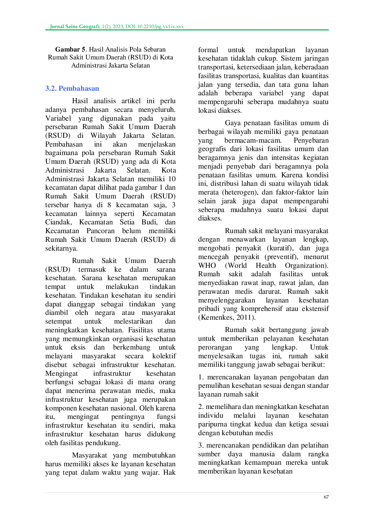 Jurnal Sains GeografiJurnal Sains GeografiFasilitas pelayanan kesehatan adalah tempat dan/atau fasilitas yang digunakan untuk memfasilitasi pelayanan kesehatan, baik yang bersifat preventif, kuratif, maupun rehabilitasi. Selain itu, pemerintah berkomitmen untuk memberikan akses pelayanan kesehatan dan keselamatan dasar kepada setiap warga negara dengan tujuan memberikan pelayanan yang lebih berkualitas, khususnya di bidang akses fasilitas yang aman dan kemudahan pergerakan dari berbagai sudut pandang. Kota Administrasi Jakarta Selatan mempunyai luas wilayah sekitar ± 145,73 km2 dengan jumlah penduduk sebanyak ± 2.206.732 jiwa dan merupakan wilayah terluas kedua di Provinsi DKI Jakarta setelah Jakarta Timur. RSUD merupakan salah satu pilar utama dalam sistem pelayanan kesehatan yang berfungsi untuk memberikan aksesibilitas dan kualitas layanan kesehatan yang diperlukan oleh masyarakat di daerah tersebut. RSUD di wilayah Jakarta Selatan belum merata di setiap Kecamatan, oleh karena itu perlu untuk menganalisis persebaran pola distribusi dari satu titik ke titik lainya. Dengan mengetahui pola distribusi titik dalam ruang akan memudahkan kita untuk mencari solusi penyebab pola titik dalam ruang tersebut terbentuk, oleh karena itu deteksi pola titik penting untuk diketahui, kita dapat menganalisis pola sebaran titik dengan menggunakan metode Nearest Neighbor Analysis (NNA).