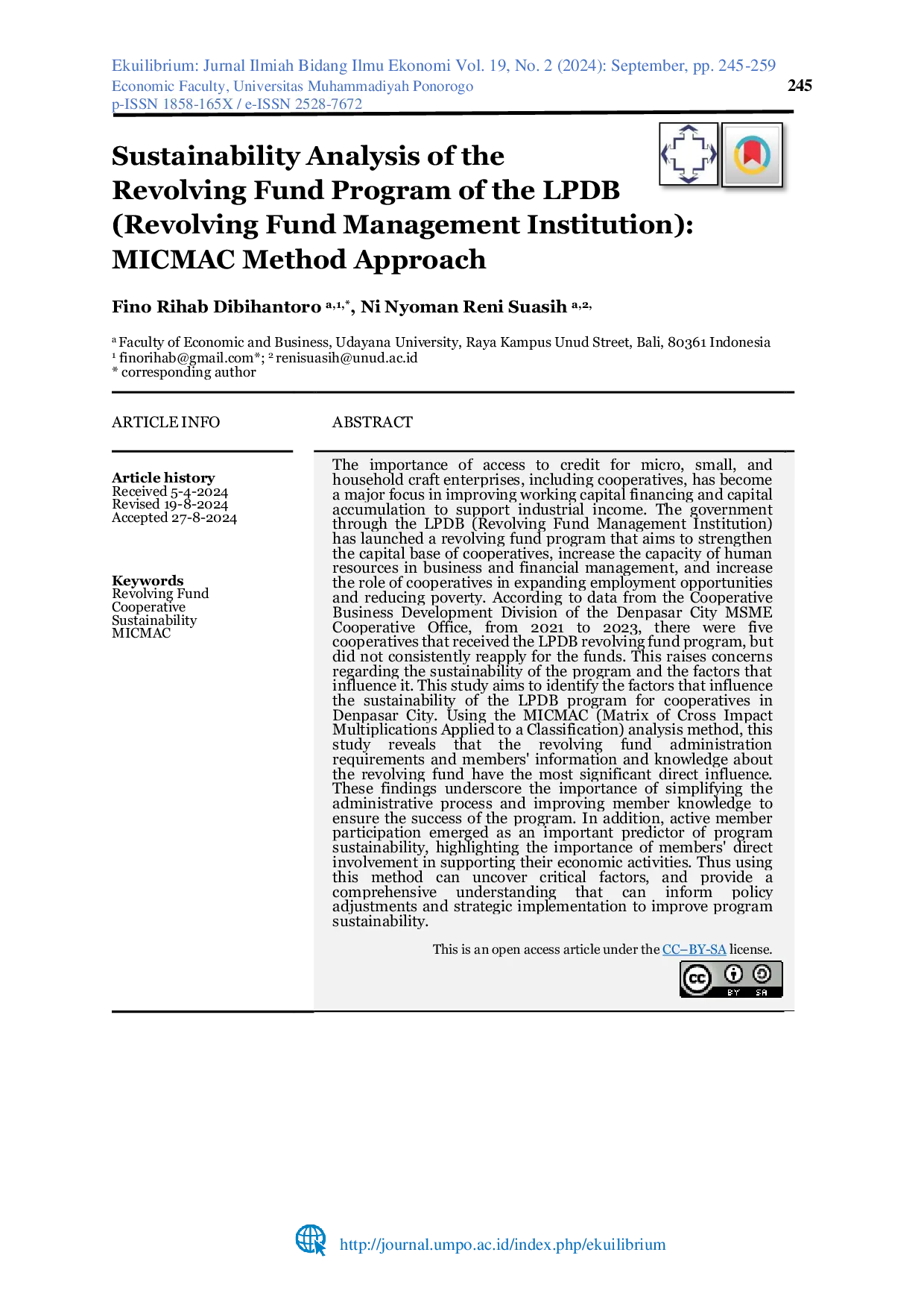 Ekuilibrium : Jurnal Ilmiah Bidang Ilmu EkonomiEkuilibrium : Jurnal Ilmiah Bidang Ilmu EkonomiThe importance of access to credit for micro, small, and household craft enterprises, including cooperatives, has become a major focus in improving working capital financing and capital accumulation to support industrial income. The government through the LPDB (Revolving Fund Management Institution) has launched a revolving fund program that aims to strengthen the capital base of cooperatives, increase the capacity of human resources in business and financial management, and increase the role of cooperatives in expanding employment opportunities and reducing poverty. According to data from the Cooperative Business Development Division of the Denpasar City MSME Cooperative Office, from 2021 to 2023, there were five cooperatives that received the LPDB revolving fund program, but did not consistently reapply for the funds. This raises concerns regarding the sustainability of the program and the factors that influence it. This study aims to identify the factors that influence the sustainability of the LPDB program for cooperatives in Denpasar City. Using the MICMAC (Matrix of Cross Impact Multiplications Applied to a Classification) analysis method, this study reveals that administrative requirements and members information and knowledge about the revolving fund have the most significant direct influence. These findings underscore the importance of simplifying the administrative process and improving member knowledge to ensure the success of the program. In addition, active member participation emerged as an important predictor of program sustainability, highlighting the importance of members direct involvement in supporting their economic activities. Thus using this method can uncover critical factors, and provide a comprehensive understanding that can inform policy adjustments and strategic implementation to improve program sustainability.