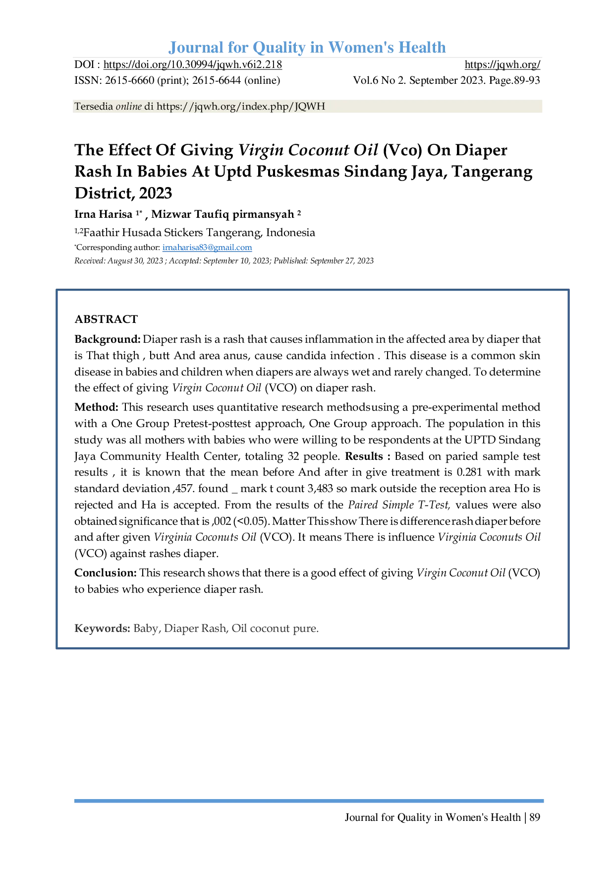 Journal for Quality in Women's HealthJournal for Quality in Women's HealthLatar belakang: Ruam popok adalah ruam yang menyebabkan peradangan pada area yang terkena popok, seperti paha, bokong, dan sekitar anus, serta dapat menyebabkan infeksi candida. Penyakit ini merupakan gangguan kulit umum pada bayi dan anak yang sering terjadi ketika popok selalu basah dan jarang diganti. Tujuan penelitian ini adalah untuk mengetahui pengaruh pemberian minyak kelapa murni (VCO) terhadap ruam popok. Metode: Penelitian ini menggunakan metode kuantitatif dengan pendekatan pre-eksperimental satu kelompok pretest-posttest. Populasi penelitian adalah seluruh ibu yang memiliki bayi dan bersedia menjadi responden di UPTD Puskesmas Sindang Jaya, berjumlah 32 orang. Hasil: Berdasarkan uji paired sample t-test, diperoleh rata-rata sebelum dan sesudah perlakuan sebesar 0,281 dengan standar deviasi 0,457. Nilai t hitung sebesar 3,483 berada di luar daerah penerimaan H0 sehingga H0 ditolak dan Ha diterima. Nilai signifikansi diperoleh sebesar 0,002 (<0,05), menunjukkan adanya perbedaan tingkat ruam popok sebelum dan sesudah pemberian VCO. Hal ini menunjukkan bahwa terdapat pengaruh pemberian minyak kelapa murni (VCO) terhadap ruam popok. Kesimpulan: Penelitian ini menunjukkan bahwa pemberian minyak kelapa murni (VCO) memberikan pengaruh yang baik terhadap bayi yang mengalami ruam popok.