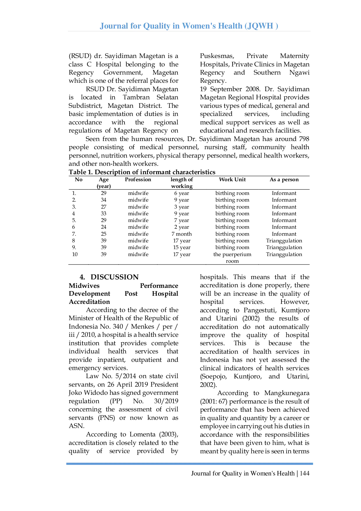 Journal for Quality in Women's HealthJournal for Quality in Women's HealthRumah sakit yang terakreditasi merupakan alat untuk mengukur kinerja rumah sakit. Desain penelitian ini bersifat kualitatif menggunakan purposive sampling snowball dengan fokus penelitian ditujukan untuk menganalisis kinerja bidan di RSUD dr. Sayidiman Magetan setelah akreditasi rumah sakit. Dengan sampel sebanyak 7 orang dan triangulasi 3 orang. Berdasarkan hasil penelitian, dapat disimpulkan bahwa secara umum perkembangan kinerja bidan setelah akreditasi rumah sakit belum meningkat, namun peraturan yang diterapkan di rumah sakit, misalnya jam berkunjung pasien belum terpenuhi. Jumlah bidan cukup banyak, tetapi masalahnya adalah penggunaan bidan yang tidak sesuai dengan tugas pokok mereka, misalnya ruang bersalin untuk supervisor 2, kemudian bidan terampil 4, bidan terampil 16.