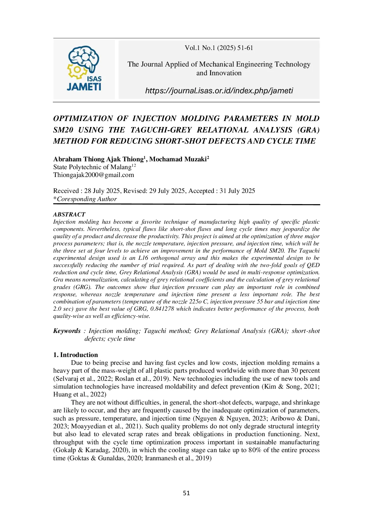 Pertama, perlu dilakukan penelitian lanjutan untuk menguji pengaruh parameter waktu injeksi dalam rentang yang lebih luas, terutama durasi sangat pendek, untuk mengetahui apakah terdapat ambang batas tertentu yang secara nyata memengaruhi kualitas produk meskipun tidak terdeteksi dalam penelitian ini. Kedua, disarankan untuk mengembangkan studi yang mengevaluasi kombinasi parameter di luar level-level yang digunakan dalam penelitian ini, terutama variasi suhu nozel di atas 230°C dan tekanan injeksi di bawah 40 bar, guna mengeksplorasi potensi peningkatan kinerja yang lebih optimal. Ketiga, penelitian berikutnya dapat merancang eksperimen dengan memasukkan parameter tambahan seperti suhu cetakan dan tekanan penahan yang telah disebutkan dalam literatur sebagai faktor penting, agar diperoleh model optimasi yang lebih komprehensif dan representatif terhadap kondisi produksi nyata. Dengan menggabungkan variasi ekstrem pada parameter waktu dan tekanan, serta memperluas ruang desain eksperimen, diharapkan dapat ditemukan konfigurasi proses yang lebih efisien dan stabil. Penelitian semacam ini akan melengkapi temuan saat ini dengan menjawab ketidakjelasan mengenai potensi parameter yang sebelumnya dianggap tidak signifikan. Selain itu, pendekatan ini dapat mengungkap interaksi antar-parameter yang tidak teramati dalam desain L16. Hasilnya akan memberikan pedoman yang lebih kuat bagi industri dalam menyesuaikan proses produksi secara presisi. Semua penelitian usulan tetap berpegang pada metode Taguchi-GRA agar konsisten dan memungkinkan perbandingan langsung. Fokus pada parameter tambahan juga menjawab saran dalam paper ini yang mengarah pada eksplorasi kombinasi berbeda. Pendekatan sistematis seperti ini akan memperdalam pemahaman terhadap dinamika proses pencetakan injeksi.