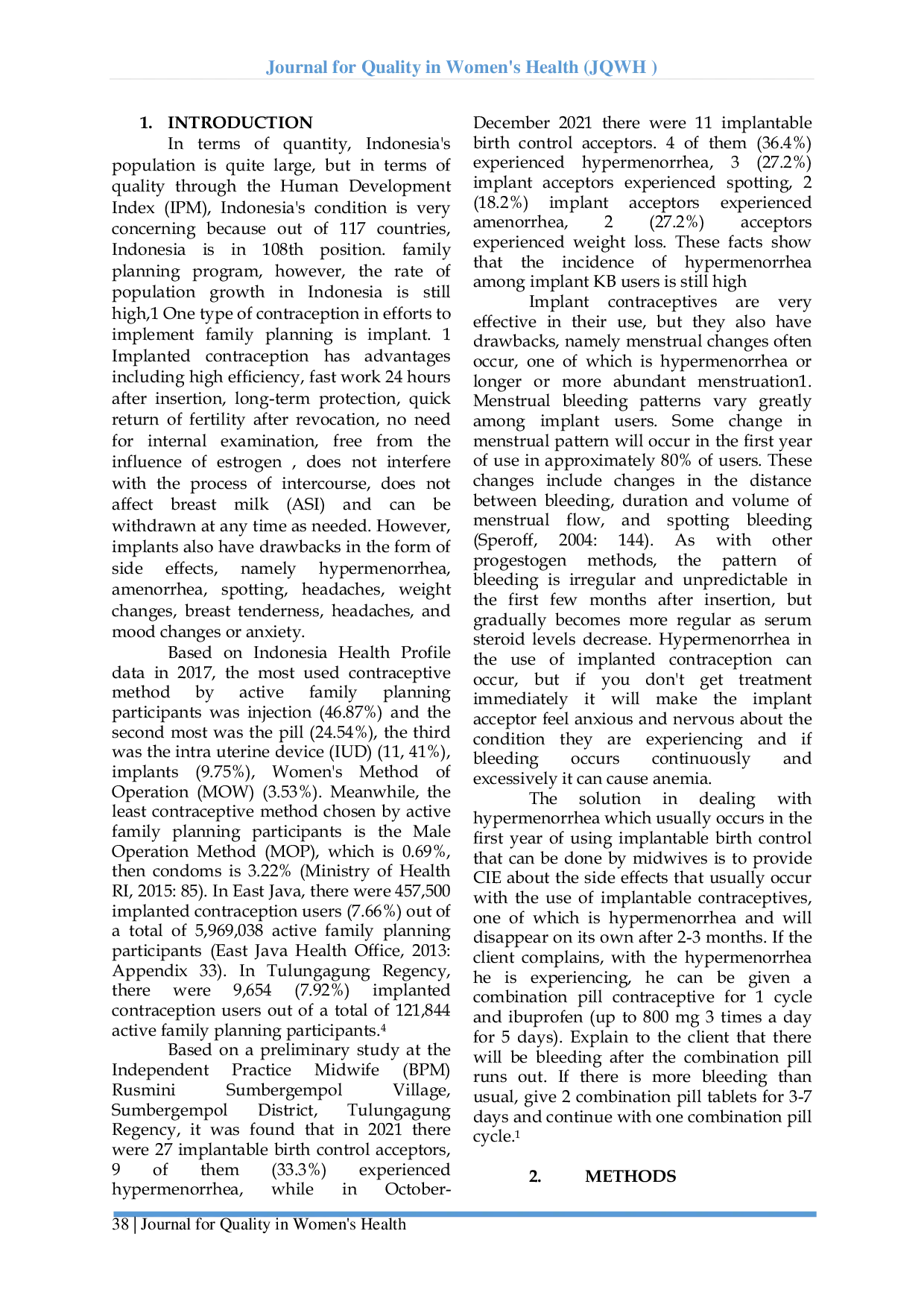 Journal for Quality in Women's HealthJournal for Quality in Women's HealthThe high rate of population growth in Indonesia requires continued attention through family planning programs. This study describes implant family planning acceptors experiencing hypermenorrhea and anemia at BPM Rusmini, Sumbergempol District, Tulungagung Regency in 2022. The research employed a descriptive design with a sample size of 14 respondents. Results indicate that most respondents are over 30 years old, housewives with elementary-high school education, and have two or fewer children. The majority have been using family planning for five years or less, with half having children aged two years or less. The study aligns with the theory that continuous hypermenorrhea can cause maternal anxiety and, if prolonged, can lead to anemia, particularly among those with lower educational levels.