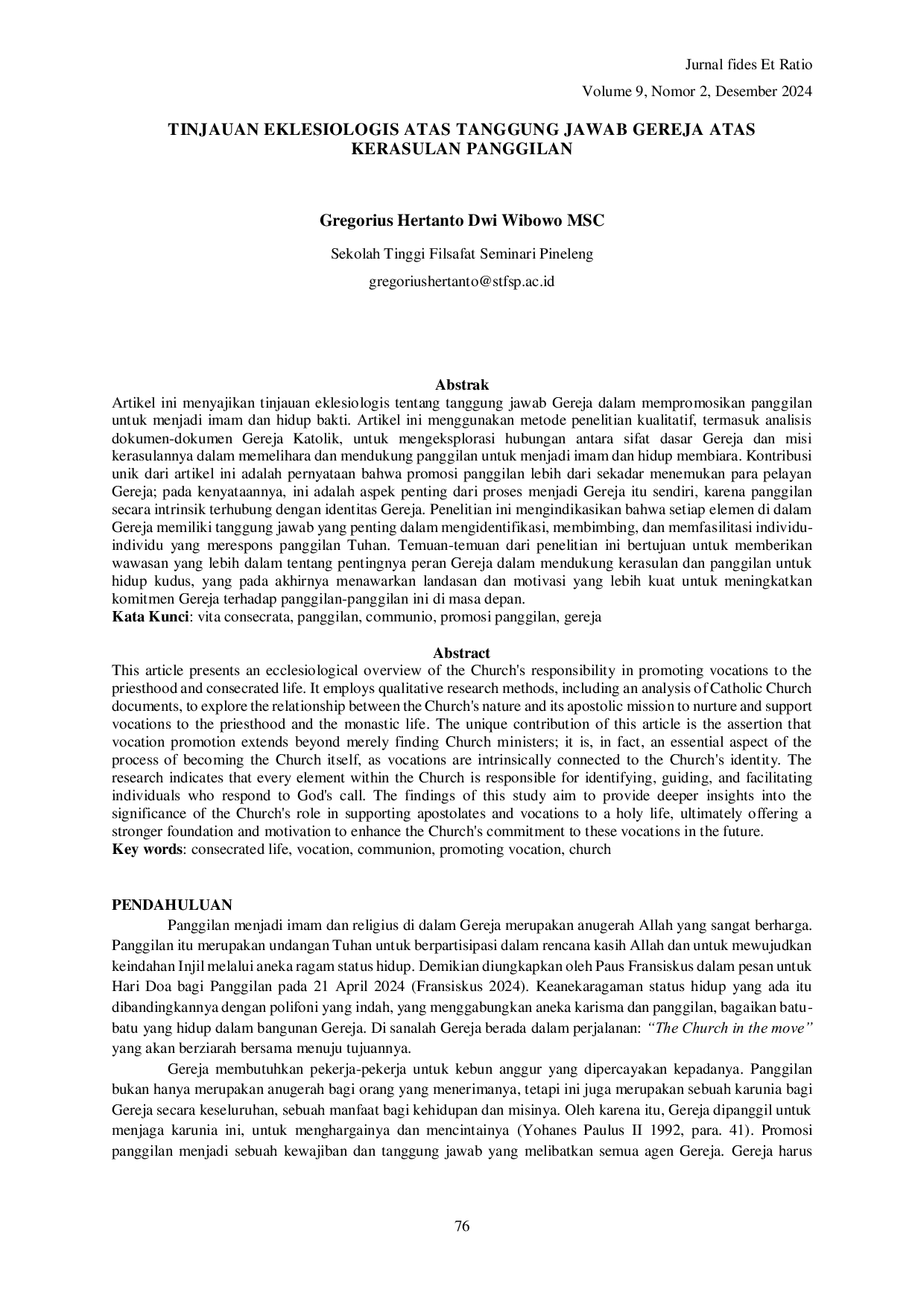 Fides et Ratio : Jurnal Teologi Kontekstual Seminari Tinggi St. Fransiskus Xaverius AmbonFides et Ratio : Jurnal Teologi Kontekstual Seminari Tinggi St. Fransiskus Xaverius AmbonArtikel ini menyajikan tinjauan eklesiologis tentang tanggung jawab Gereja dalam mempromosikan panggilan untuk menjadi imam dan hidup bakti. Artikel ini menggunakan metode penelitian kualitatif, termasuk analisis dokumen-dokumen Gereja Katolik, untuk mengeksplorasi hubungan antara sifat dasar Gereja dan misi kerasulannya dalam memelihara dan mendukung panggilan untuk menjadi imam dan hidup membiara. Kontribusi unik dari artikel ini adalah pernyataan bahwa promosi panggilan lebih dari sekadar menemukan para pelayan Gereja; pada kenyataannya, ini adalah aspek penting dari proses menjadi Gereja itu sendiri, karena panggilan secara intrinsik terhubung dengan identitas Gereja. Penelitian ini mengindikasikan bahwa setiap elemen di dalam Gereja memiliki tanggung jawab yang penting dalam mengidentifikasi, membimbing, dan memfasilitasi individu-individu yang merespons panggilan Tuhan. Temuan-temuan dari penelitian ini bertujuan untuk memberikan wawasan yang lebih dalam tentang pentingnya peran Gereja dalam mendukung kerasulan dan panggilan untuk hidup kudus, yang pada akhirnya menawarkan landasan dan motivasi yang lebih kuat untuk meningkatkan komitmen Gereja terhadap panggilan-panggilan ini di masa depan.