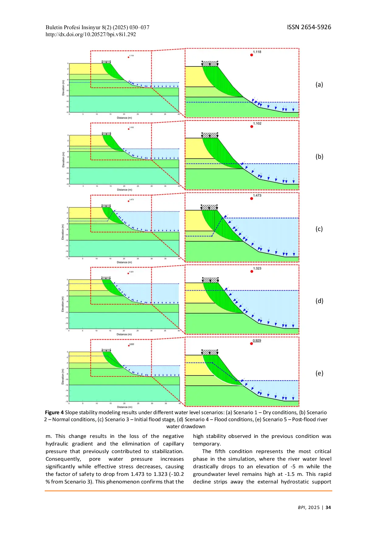 Buletin Profesi InsinyurBuletin Profesi InsinyurThis study investigates the stability of natural slopes along the Martapura River, particularly in areas adjacent to roadways, with a focus on assessing the impact of river water level fluctuations on slope safety factors. The analysis was performed using SLOPE/W, a GeoStudio module, based on the widely adopted limit equilibrium method. Several hydrological scenarios, including dry, normal, rapid rise, and rapid drawdown conditions, were simulated to evaluate their influence on slope behavior. The results demonstrate that both river and groundwater level variations significantly affect slope stability. Rising groundwater levels increase pore water pressure, reduce effective stress, and lower the factor of safety (FS) from 1.118 under dry conditions to 1.102 in the normal-water scenario (−1.4%). In contrast, a sudden increase in river level induces a temporary stabilizing effect, elevating the FS to 1.473 ( 33.7% relative to normal), before stabilizing at 1.323. The most critical condition arises during rapid drawdown, where a sudden drop in river level while groundwater remains high leads to elevated pore pressure, loss of hydrostatic support, and a significant FS reduction to 0.929 (−30%), posing a risk of slope failure. Moreover, the hydrologic hysteresis between river and groundwater responses, mainly governed by soil permeability, emerges as a key factor influencing slope stability dynamics. These findings highlight the importance of integrating hydrological variability into slope monitoring and risk mitigation strategies.