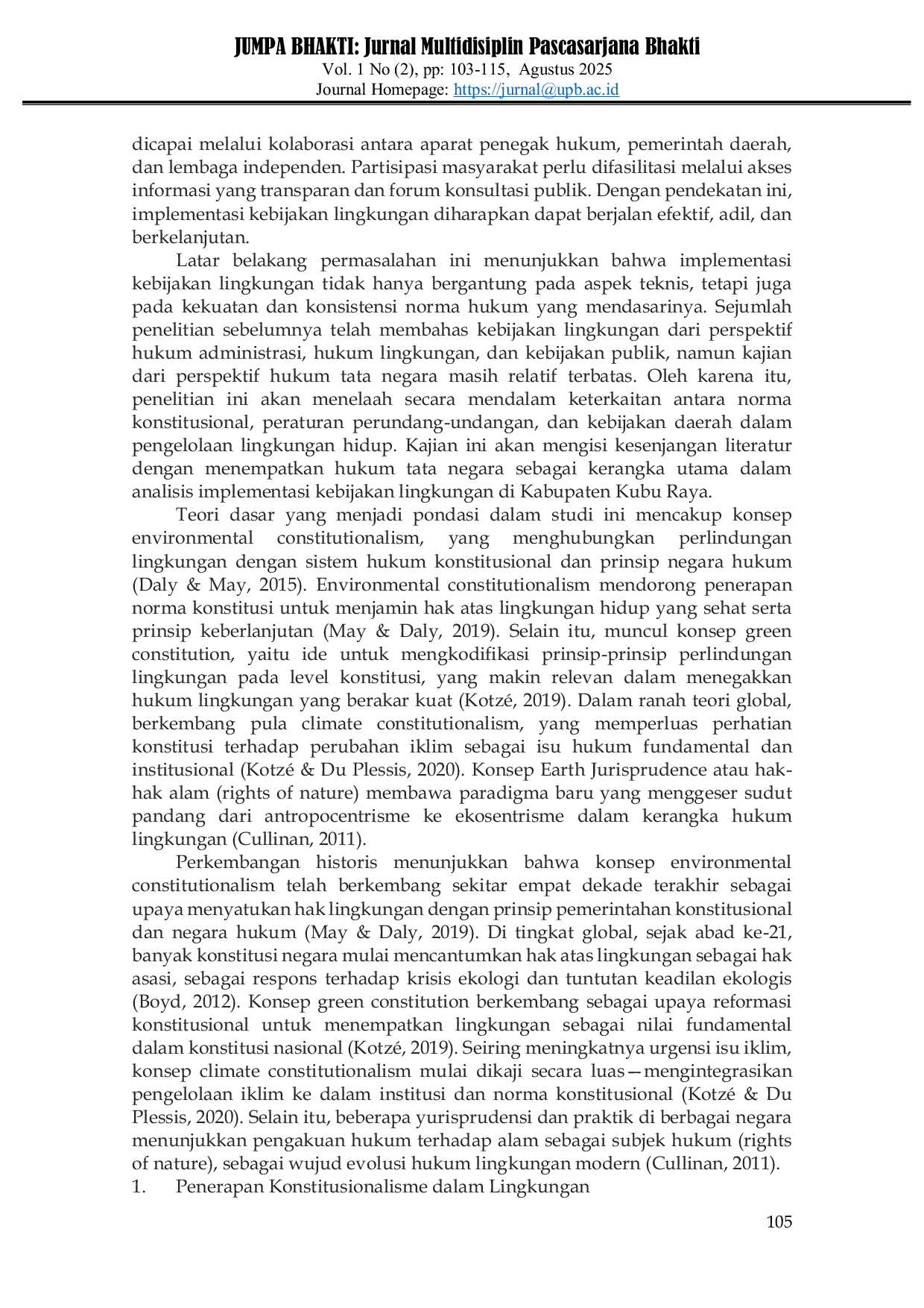 JUMPA BHAKTI : (JURNAL MULTIDISIPLIN PASCASARJANA) BHAKTIJUMPA BHAKTI : (JURNAL MULTIDISIPLIN PASCASARJANA) BHAKTIPengelolaan lingkungan hidup merupakan salah satu mandat konstitusional yang diatur dalam peraturan perundang-undangan Indonesia. Kabupaten Kubu Raya memiliki kebijakan lingkungan yang penting untuk dikaji dari perspektif hukum tata negara guna menilai kesesuaiannya dengan prinsip-prinsip hukum yang berlaku. Penelitian ini bertujuan untuk menganalisis implementasi kebijakan lingkungan di Kabupaten Kubu Raya dalam perspektif hukum tata negara berdasarkan ketentuan peraturan perundang-undangan. Penelitian menggunakan pendekatan yuridis-normatif dengan menelaah peraturan perundang-undangan, doktrin hukum, dan putusan pengadilan yang relevan. Analisis dilakukan melalui interpretasi hukum terhadap norma-norma yang mengatur kebijakan lingkungan, serta sinkronisasi vertikal dan horizontal antara kebijakan daerah dan regulasi nasional. Kajian pustaka menjadi sumber utama dalam merumuskan temuan penelitian. Hasil penelitian menunjukkan bahwa kebijakan lingkungan di Kabupaten Kubu Raya secara umum telah berlandaskan pada kerangka hukum nasional, namun terdapat beberapa aspek yang memerlukan harmonisasi peraturan daerah dengan undang-undang. Prinsip partisipasi publik, transparansi, dan akuntabilitas telah diakomodasi secara normatif, tetapi masih memerlukan penguatan dalam instrumen hukum daerah. Regulasi daerah memiliki peluang untuk lebih adaptif terhadap dinamika lingkungan hidup dan kebutuhan masyarakat.