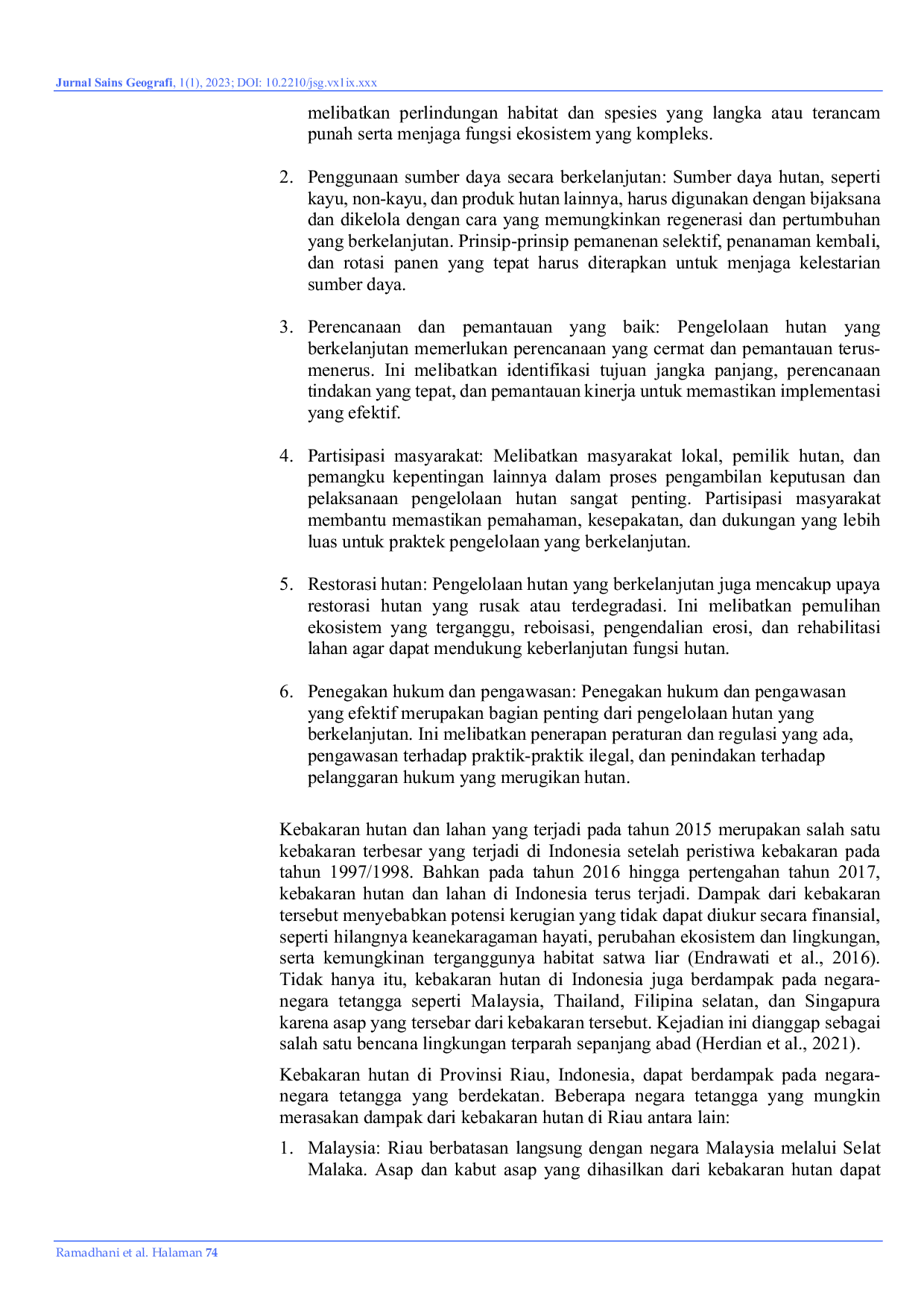 Jurnal Sains GeografiJurnal Sains GeografiPenelitian ini mengenali parameter-parameter pemicu kejadian kebakaran hutan, mengukur sejauh mana risiko kebakaran hutan, serta menciptakan peta digital yang menggambarkan lokasi kebakaran hutan di Provinsi Riau. Pendekatan yang diterapkan meliputi pengolahan citra, analisis data, manipulasi gambar, dan penilaian bobot. Pada tahap pengolahan citra, dilakukan pra-pemrosesan yang meliputi penggabungan pita citra, koreksi geometrik, mosaik citra, dan pemotongan citra, dan klasifikasi terbimbing. Data hotspot diperoleh dari sumber eksternal diolah menggunakan ArcGIS dengan analisis spasial seperti kernel density untuk mendapatkan kepadatan titik hotspot. Data curah hujan diproses menggunakan metode inverse distance weighted dalam alat-alat Spatial Analyst. Selanjutnya, dilakukan pembobotan terhadap curah hujan, penggunaan lahan, dan titik api. Dalam proses pembobotan, bobot diberikan sesuai dengan dampak masing-masing indikator terhadap kebakaran hutan. Hasil analisis menunjukkan potensi kerawanan kebakaran hutan di Provinsi Riau dipengaruhi oleh curah hujan yang rendah, jenis tutupan lahan yang berubah, dan adanya titik api. Penurunan curah hujan mengurangi ketersediaan air di wilayah hutan dan mempercepat kekeringan tumbuhan, sementara perubahan tutupan lahan mempengaruhi tingkat kerawanan terhadap kebakaran. Titik api menjadi faktor utama pada peningkatan risiko kebakaran hutan. Dalam peta kerawanan kebakaran hutan yang dihasilkan, terlihat tingkat kerawanan yang berbeda-beda, mulai dari tidak rawan hingga sangat rawan. Peta ini memberikan informasi yang berguna dalam penanganan dan mitigasi kebakaran hutan di Provinsi Riau.