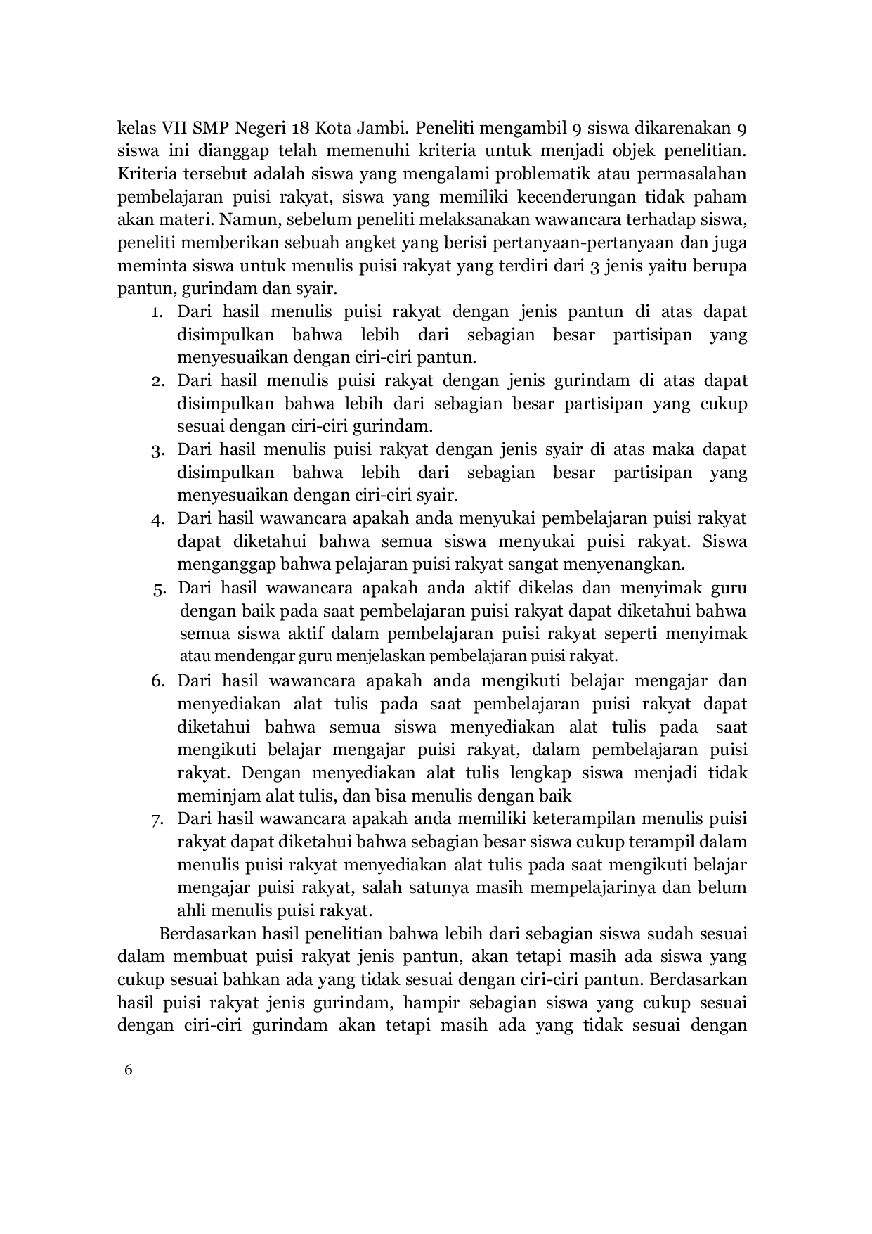 Berdasarkan uraian hasil penelitian yang diperoleh informasi mengenai problematik pembelajaran puisi rakyat siswa kelas VII SMP Negeri 18 Kota Jambi tahun ajaran 2021/2022, sebagai berikut.Sebagian besar siswa telah menyesuaikan puisi rakyat dengan ciri-ciri pantun.Sebagian besar siswa cukup menyesuaikan puisi rakyat dengan ciri-ciri gurindam.Sebagian besar siswa menyesuaikan puisi rakyat dengan ciri-ciri syair.Semua siswa aktif dalam pembelajaran puisi rakyat.Sebagian besar siswa cukup terampil menulis puisi rakyat.Berdasarkan kesimpulan tersebut, problematik pembelajaran puisi rakyat siswa kelas VII SMP Negeri 18 Kota Jambi, maka implikasinya adalah para partisipan akan mengoreksi diri agar problematik yang sebelumnya terjadi dalam menulis puisi rakyat seperti pantun, gurindam dan syair tidak terulang kembali.