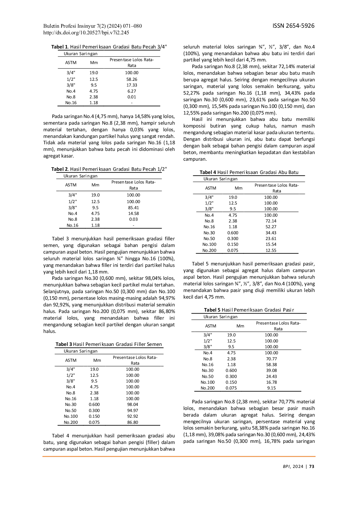Buletin Profesi InsinyurBuletin Profesi InsinyurJalan raya merupakan infrastruktur vital yang berperan sebagai sarana penghubung antarwilayah. Kerusakan jalan tidak hanya menghambat aktivitas perekonomian, tetapi juga berpotensi menyebabkan kecelakaan. Salah satu permasalahan utama yang dihadapi di Provinsi Nusa Tenggara Timur (NTT) adalah degradasi jalan akibat kualitas aspal yang buruk. Berdasarkan data DJBM PUPR tahun 2023, 70,23% kondisi jalan di NTT mengalami kerusakan sedang hingga berat. Komposisi aspal hotmix merupakan faktor krusial yang mempengaruhi kualitas perkerasan jalan. Campuran aspal terdiri dari agregat kasar dan halus yang harus memenuhi standar pengujian agregat, yang salah satunya ditentukan melalui uji analisis saringan (gradasi). Pada penelitian ini, campuran beton aspal AC-WC (Asphalt Concrete – Wearing Course) dirancang menggunakan metode Marshall untuk menentukan kadar aspal optimal (KAO). Material yang digunakan berasal dari Quarry Kali Mio milik PT. Nanda Karya Putra Pratama, sementara data uji laboratorium diperoleh dari PT. Nanda Putra Pratama Karya. Hasil penelitian menunjukkan bahwa parameter Marshall yang memenuhi standar Bina Marga Terkendali Revisi II Tahun 2018 adalah stability sebesar 1150,65 kg, flow 3,13 mm, Marshall quotient 1,15, VIM 3,48%, VMA 16,75%, dan VFB 79,26%. Berdasarkan analisis, KAO yang diperoleh dalam penelitian ini adalah 6,0%, yang diharapkan dapat meningkatkan kualitas dan daya tahan perkerasan jalan di wilayah NTT.