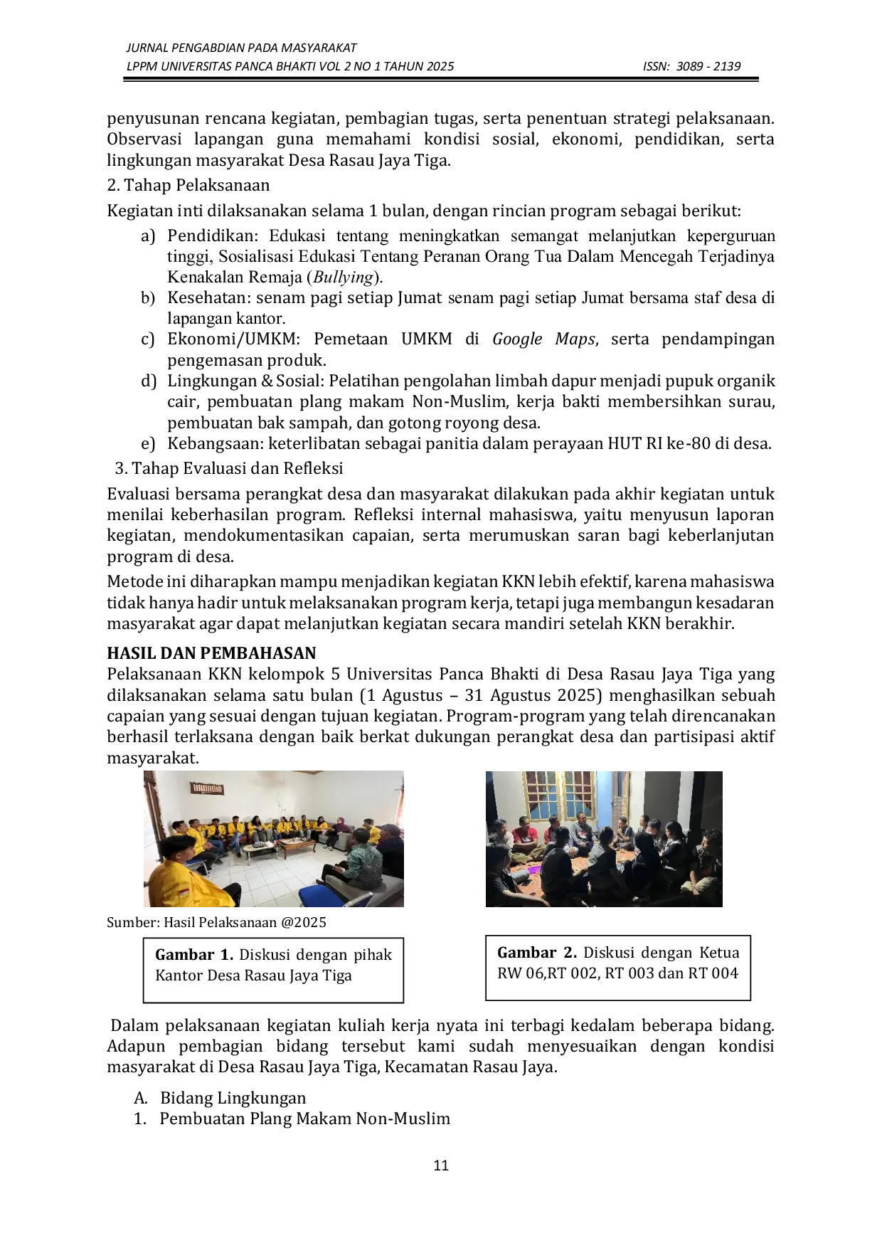 Dianmas Bhakti: Jurnal Pengabdian pada MasyarakatDianmas Bhakti: Jurnal Pengabdian pada MasyarakatProgram Kuliah Kerja Nyata (KKN) merupakan bentuk pengabdian mahasiswa kepada masyarakat melalui penerapan ilmu yang diperoleh selama perkuliahan. KKN kelompok 5 Universitas Panca Bhakti dilaksanakan di Desa Rasau Jaya Tiga, Kecamatan Rasau Jaya, Kabupaten Kubu Raya, selama satu bulan (1–31 Agustus 2025). Desa ini mayoritas dihuni oleh petani dengan berbagai permasalahan, seperti kurangnya edukasi tentang pentingnya melanjutkan pendidikan, penerapan hidup sehat, kesadaran kebersihan fasilitas kerohanian, serta kebutuhan dukungan di bidang pertanian. Program kerja yang dilaksanakan meliputi kegiatan edukasi perkuliahan, sosialisasi peran orang tua dalam pembentukan karakter remaja, pengolahan limbah dapur menjadi pupuk organik cair, senam pagi, kerja bakti, pembuatan bak sampah, pembuatan plang makam non-Muslim, serta pemetaan UMKM melalui Google Maps. Selain itu, mahasiswa juga berpartisipasi dalam kegiatan desa, termasuk menjadi panitia HUT RI ke-80. Seluruh program dapat terlaksana dengan baik dan memperoleh respon positif dari masyarakat, sehingga diharapkan mampu memberikan dampak berkelanjutan bagi Desa Rasau Jaya Tiga.