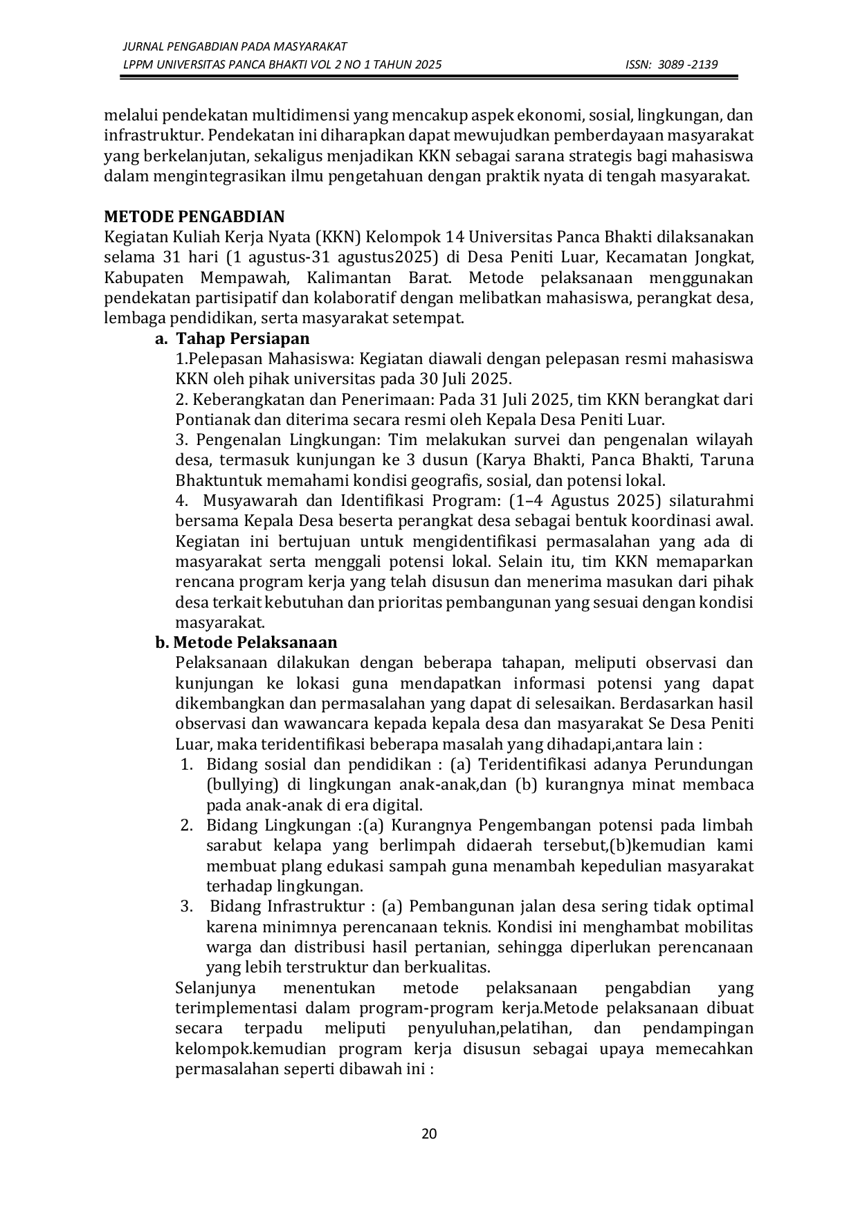 Dianmas Bhakti: Jurnal Pengabdian pada MasyarakatDianmas Bhakti: Jurnal Pengabdian pada MasyarakatPengabdian kepada masyarakat merupakan bagian penting dari Tridharma Perguruan Tinggi yang mendorong peran aktif perguruan tinggi dalam pembangunan. Program Kuliah Kerja Nyata (KKN) menjadi salah satu bentuk nyata melalui pendekatan pemberdayaan masyarakat berbasis potensi lokal. Desa Peniti Luar, Kecamatan Jongkat, Kabupaten Mempawah, dipilih sebagai lokasi kegiatan karena potensi sektor pertanian padi dan perkebunan kelapa yang belum tergarap optimal. Permasalahan utama di desa ini mencakup rendahnya literasi, kurangnya kesadaran terhadap isu sosial (seperti bullying dan perlindungan anak), lemahnya pengelolaan lingkungan, serta kebutuhan akan penguatan ketahanan pangan dan pembangunan infrastruktur. Kegiatan KKN dilakukan secara partisipatif melalui program lintas bidang. Bidang pendidikan dan sosial difokuskan pada peningkatan literasi, edukasi isu sosial, dan pengembangan pojok baca. Bidang ekonomi diarahkan pada pemberdayaan tani melalui pemanfaatan limbah serabut kelapa dan penanaman jagung. Bidang lingkungan meliputi kampanye sadar sampah dan edukasi perilaku hidup bersih, sedangkan bidang pembangunan fisik mencakup pembuatan tugu selamat datang dan perencanaan jalan beton. Hasil kegiatan menunjukkan peningkatan literasi, kesadaran sosial, kepedulian lingkungan, serta penguatan ekonomi lokal. KKN terbukti berperan sebagai sarana transformasi sosial dan akselerator pembangunan desa yang partisipatif, inklusif, dan berkelanjutan.