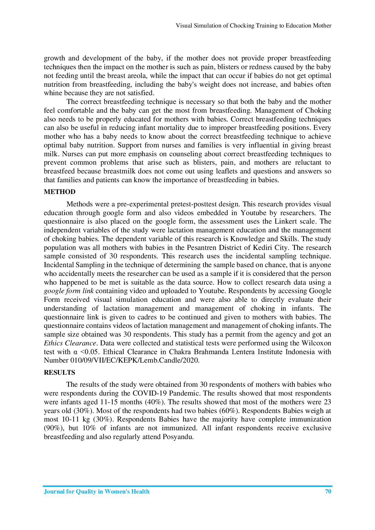 Journal for Quality in Women's HealthJournal for Quality in Women's HealthPelatihan simulasi visual dapat meningkatkan pengetahuan dan keterampilan ibu dalam menangani bayi yang tersedak selama pandemi COVID-19. Penelitian ini menggunakan desain pre-eksperimental dengan populasi ibu di Kediri, Jawa Timur. Sampel terdiri dari 30 responden dengan teknik incidental sampling. Hasil penelitian menunjukkan peningkatan signifikan dalam pengetahuan dan keterampilan penanganan tersedak setelah pelatihan simulasi visual. Pencegahan tersedak lebih penting dalam mengurangi morbiditas kasus terkait nutrisi dan kejadian tersedak pada bayi.