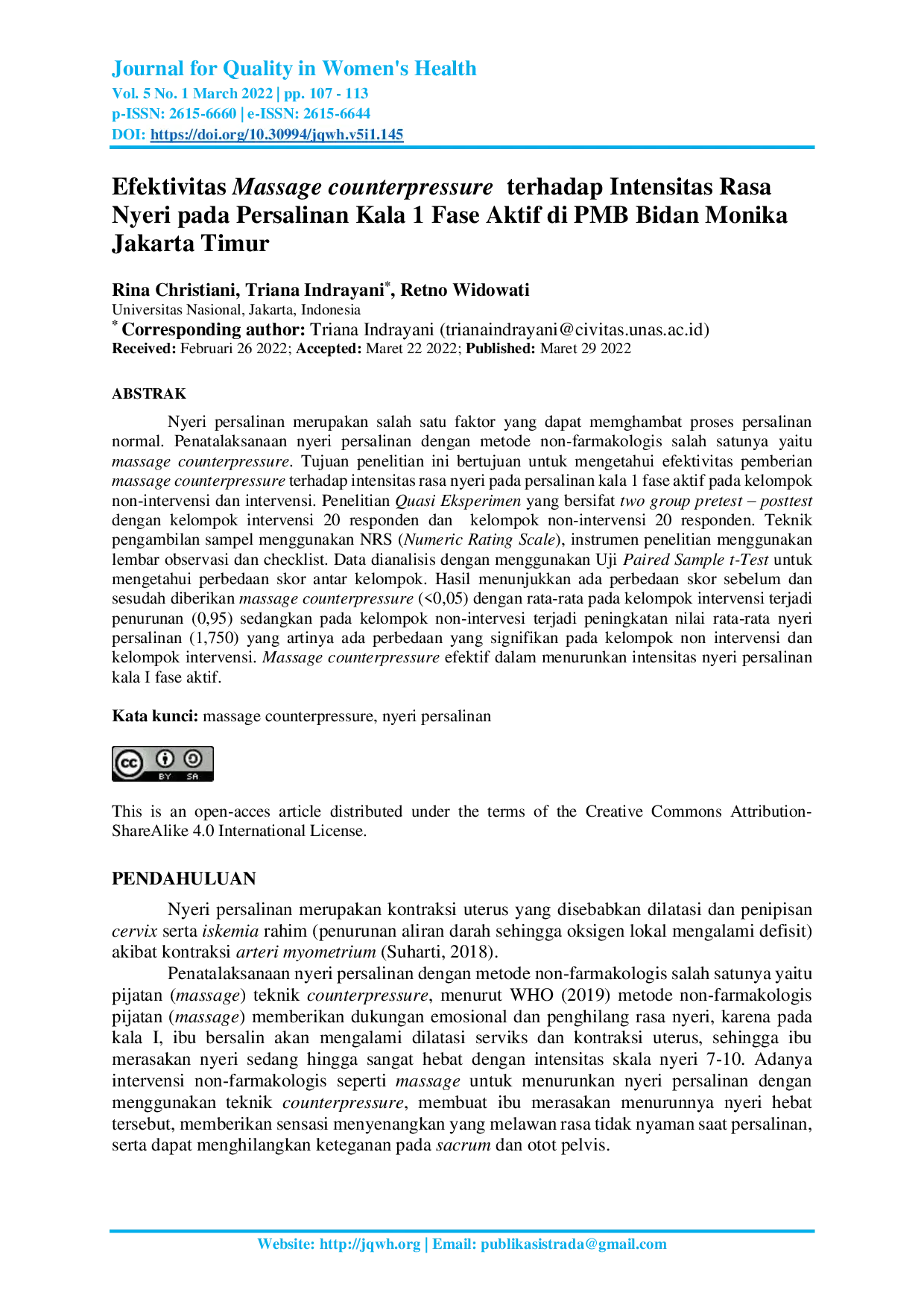 Journal for Quality in Women's HealthJournal for Quality in Women's HealthNyeri persalinan merupakan salah satu faktor yang dapat menghambat proses persalinan normal. Penatalaksanaan nyeri persalinan dengan metode non-farmakologis salah satunya yaitu massage counterpressure. Tujuan penelitian ini adalah untuk mengetahui efektivitas pemberian massage counterpressure terhadap intensitas rasa nyeri pada persalinan kala 1 fase aktif pada kelompok non-intervensi dan intervensi. Penelitian Quasi Eksperimen yang bersifat two group pretest – posttest dengan kelompok intervensi 20 responden dan kelompok non-intervensi 20 responden. Teknik pengambilan sampel menggunakan NRS (Numeric Rating Scale), instrumen penelitian menggunakan lembar observasi dan checklist. Data dianalisis dengan menggunakan Uji Paired Sample t-Test untuk mengetahui perbedaan skor antar kelompok. Hasil menunjukkan ada perbedaan skor sebelum dan sesudah diberikan massage counterpressure (<0,05) dengan rata-rata pada kelompok intervensi terjadi penurunan (0,95) sedangkan pada kelompok non-intervesi terjadi peningkatan nilai rata-rata nyeri persalinan (1,750) yang artinya ada perbedaan yang signifikan pada kelompok non intervensi dan kelompok intervensi. Massage counterpressure efektif dalam menurunkan intensitas nyeri persalinan kala I fase aktif.