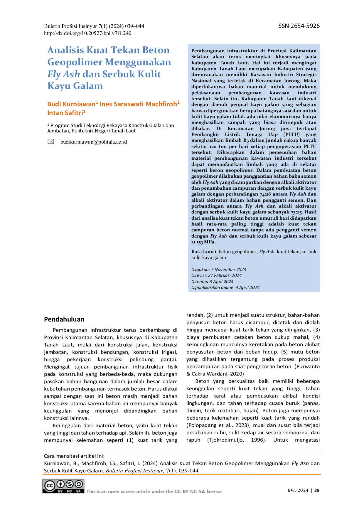 - Analisis Kuat Tekan Beton Geopolimer Menggunakan Fly Ash dan Serbuk Kulit Kayu Galam | Buletin Profesi... buletinppi.ulm.ac.id/index.php/bpi/article/view/240Analisis Kuat Tekan Beton Geopolimer Menggunakan Fly Ash dan Serbuk Kulit Kayu Galam Buletin Profesi buletinppi ulm ac index php bpi article view 240