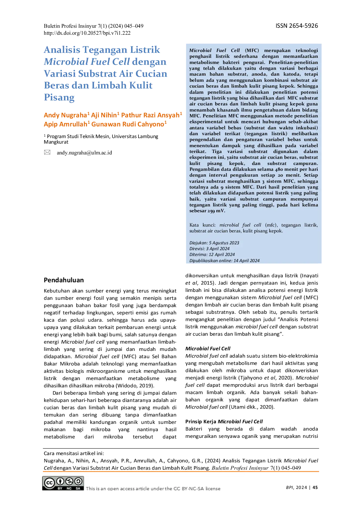 Buletin Profesi InsinyurBuletin Profesi InsinyurKebutuhan akan sumber energi yang terus meningkat dan menipisnya sumber energi fosil serta dampak negatif penggunaannya terhadap lingkungan mendorong pengembangan energi terbarukan, salah satunya melalui Microbial Fuel Cell (MFC). Penelitian ini bertujuan untuk menganalisis potensi tegangan listrik yang dihasilkan dari MFC menggunakan variasi substrat: air cucian beras, kulit pisang kepok, dan campuran keduanya. Metode eksperimental digunakan dengan mengukur tegangan listrik selama 480 menit per hari, setiap 20 menit, selama 3, 5, dan 7 hari inkubasi. Setiap variasi substrat diuji pada tiga sistem MFC, sehingga total terdapat sembilan sistem. Hasil menunjukkan bahwa substrat campuran menghasilkan tegangan listrik tertinggi, yaitu rata-rata 257 mV, dengan nilai tertinggi pada hari kelima sebesar 259 mV. Variasi substrat dan waktu inkubasi memberikan pengaruh signifikan terhadap produksi tegangan listrik.