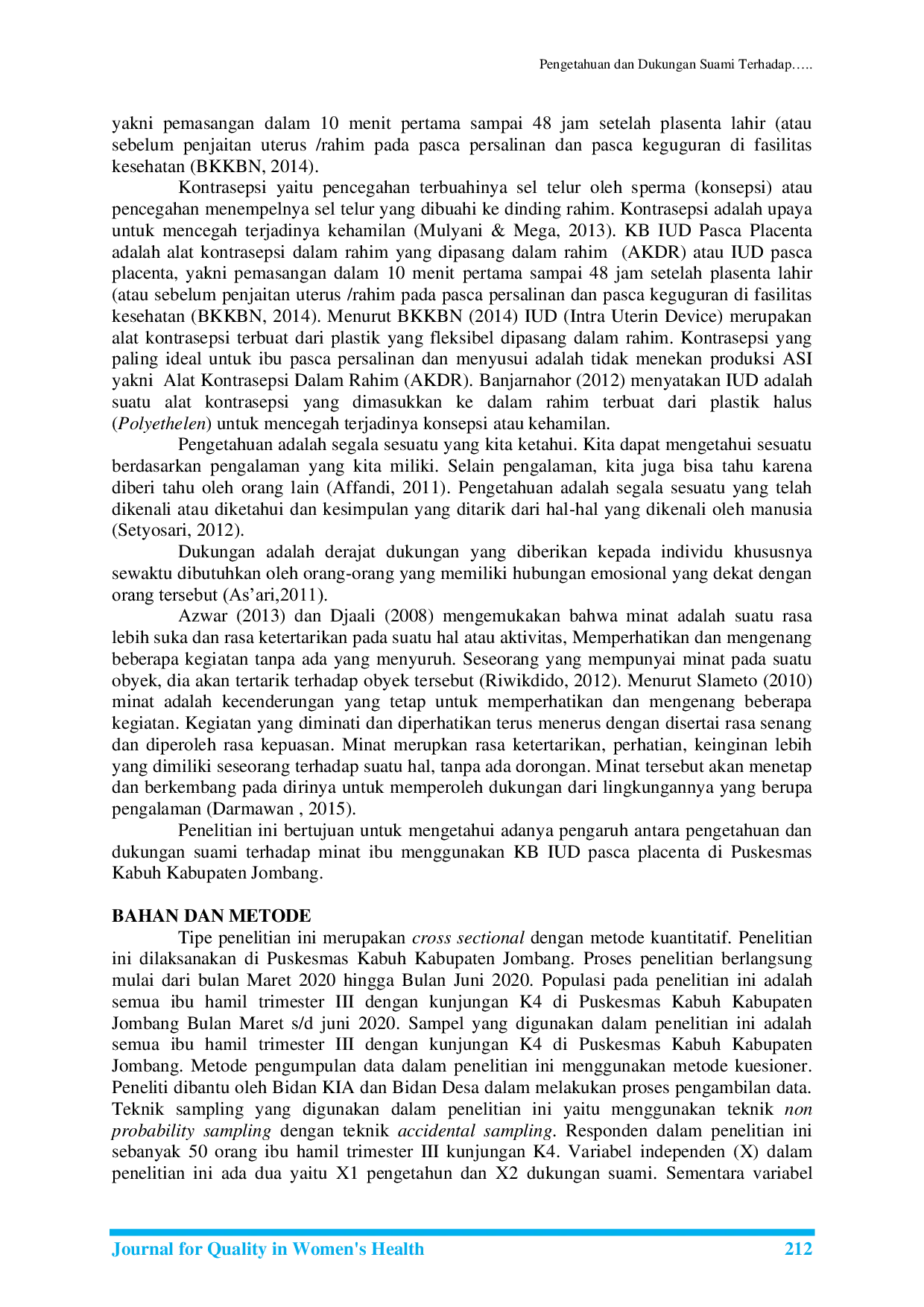 Journal for Quality in Women's HealthJournal for Quality in Women's HealthKB IUD Pasca Placenta adalah alat kontrasepsi dalam rahim yang dipasang dalam rahim (AKDR) atau IUD pasca placenta. IUD (Intra Uterin Device) merupakan alat kontrasepsi terbuat dari plastik yang fleksibel dipasang dalam rahim (BKKBN, 2014). Berdasarkan data BKKBN, pemakaian IUD di Indonesia cenderung menurun, yaitu 7,4% tahun 2003 dan mengalami penurunan tahun 2009 yaitu 4,5%. Sempat mengalami sedikit kenaikan menjadi 4,9% pada tahun 2009, namun turun lagi menjadi 4,7% pada tahun 2013. Selain itu, berdasarkan data sementara yang diperoleh di Kabupaten Jombang pada tahun 2019, pencapaian akseptor baru semua metode sebesar 9,13% dari target 10%. Pencapaian akseptor KB pasca Placenta sebesar 16,05% dari target 60%. Beberapa hal yang memengaruhi minat ibu menggunakan KB IUD pasca placenta tersebut karena pengetahuan ibu tentang KB tersebut dan dukungan suami. Penelitian ini bertujuan untuk mengetahui adanya pengaruh antara . Metode yang digunakan dalam penelitian ini yaitu kuantitatif dengan jumlah subjek 50 responden. Alat ukur yang digunakan dalam penelitian ini yaitu kuesioner pengetahuan, kuesioner dukungan suami, kuesioner minat ibu. Analisis data dilakukan dengan menggunakan uji regresi logistik dalam IBM SPSS 16 for Windows. Hasil analisis menunjukkan signifikansi variabel pengetahuan sebesar 0,999 dan variabel dukungan suami sebesar 1,000 sehingga dapat disimpulkan tidak adanya pengaruh antara pengetahuan dan dukungan suami terhadap minat ibu dalam menggunakan KB IUD pasca placenta di Puskesmas Kabuh Kabupaten Jombang.