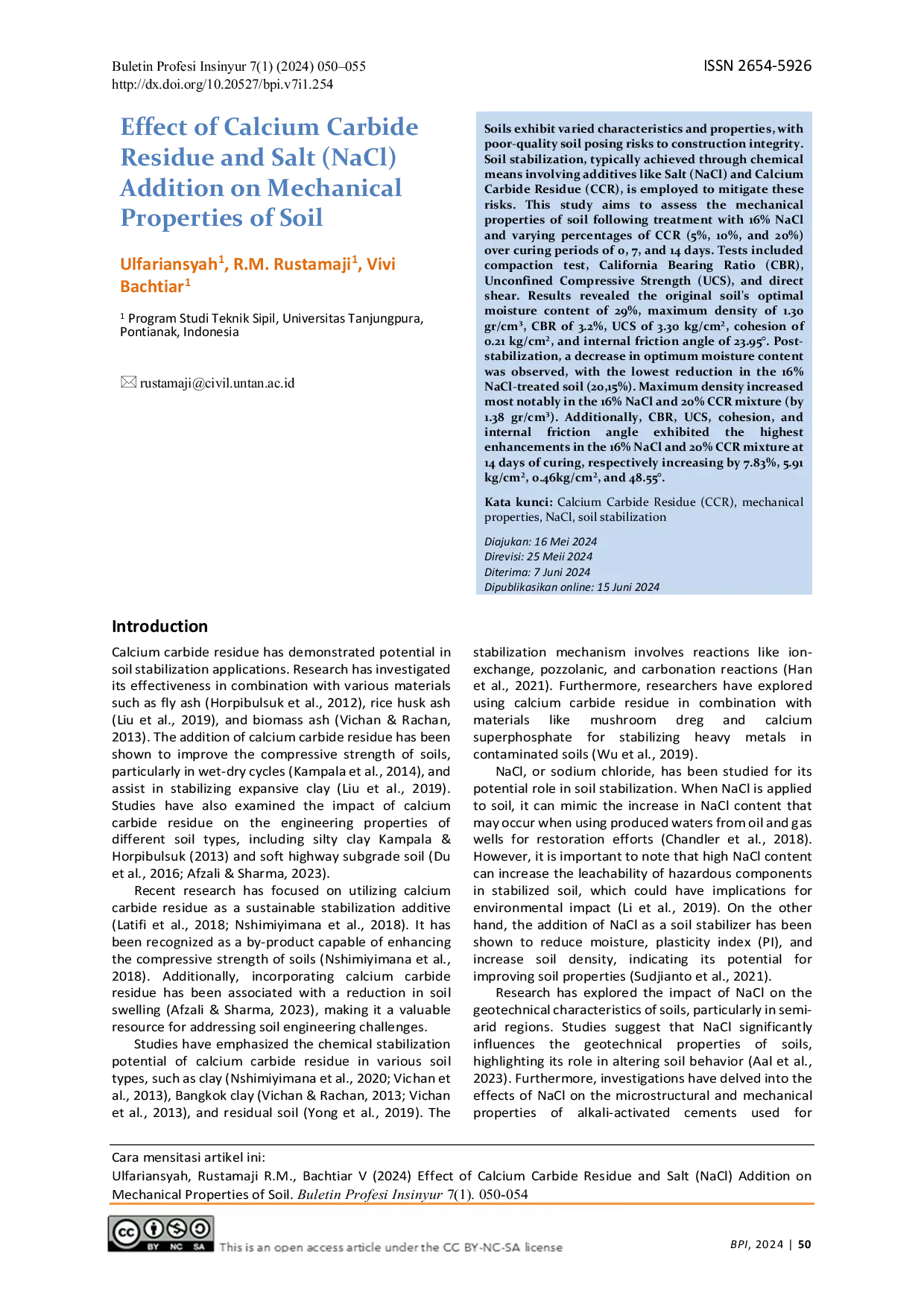Buletin Profesi InsinyurBuletin Profesi InsinyurTanah memiliki karakteristik dan sifat yang bervariasi, di mana tanah berkualitas rendah dapat membahayakan integritas konstruksi. Stabilisasi tanah, biasanya dilakukan secara kimiawi dengan bahan tambahan seperti Garam (NaCl) dan Sisa Kalsium Karbida (CCR), digunakan untuk mengurangi risiko tersebut. Penelitian ini bertujuan untuk mengevaluasi sifat mekanis tanah setelah diberi perlakuan 16% NaCl dan variasi persentase CCR (5%, 10%, dan 20%) selama periode curing 0, 7, dan 14 hari. Pengujian meliputi uji pemadatan, California Bearing Ratio (CBR), Kuat Tekan Bebas (UCS), dan geser langsung. Hasil menunjukkan kadar air optimal tanah asli sebesar 29%, kerapatan maksimum 1,30 gr/cm³, CBR 3,2%, UCS 3,30 kg/cm², kohesi 0,21 kg/cm², dan sudut geser internal 23,95°. Setelah stabilisasi, terjadi penurunan kadar air optimal, dengan penurunan terendah pada tanah yang diberi 16% NaCl (20,15%). Kerapatan maksimum meningkat paling signifikan pada campuran 16% NaCl dan 20% CCR (1,38 gr/cm³). Selain itu, CBR, UCS, kohesi, dan sudut geser internal menunjukkan peningkatan tertinggi pada campuran 16% NaCl dan 20% CCR setelah curing 14 hari, masing-masing meningkat menjadi 7,83%, 5,91 kg/cm², 0,46 kg/cm², dan 48,55°.