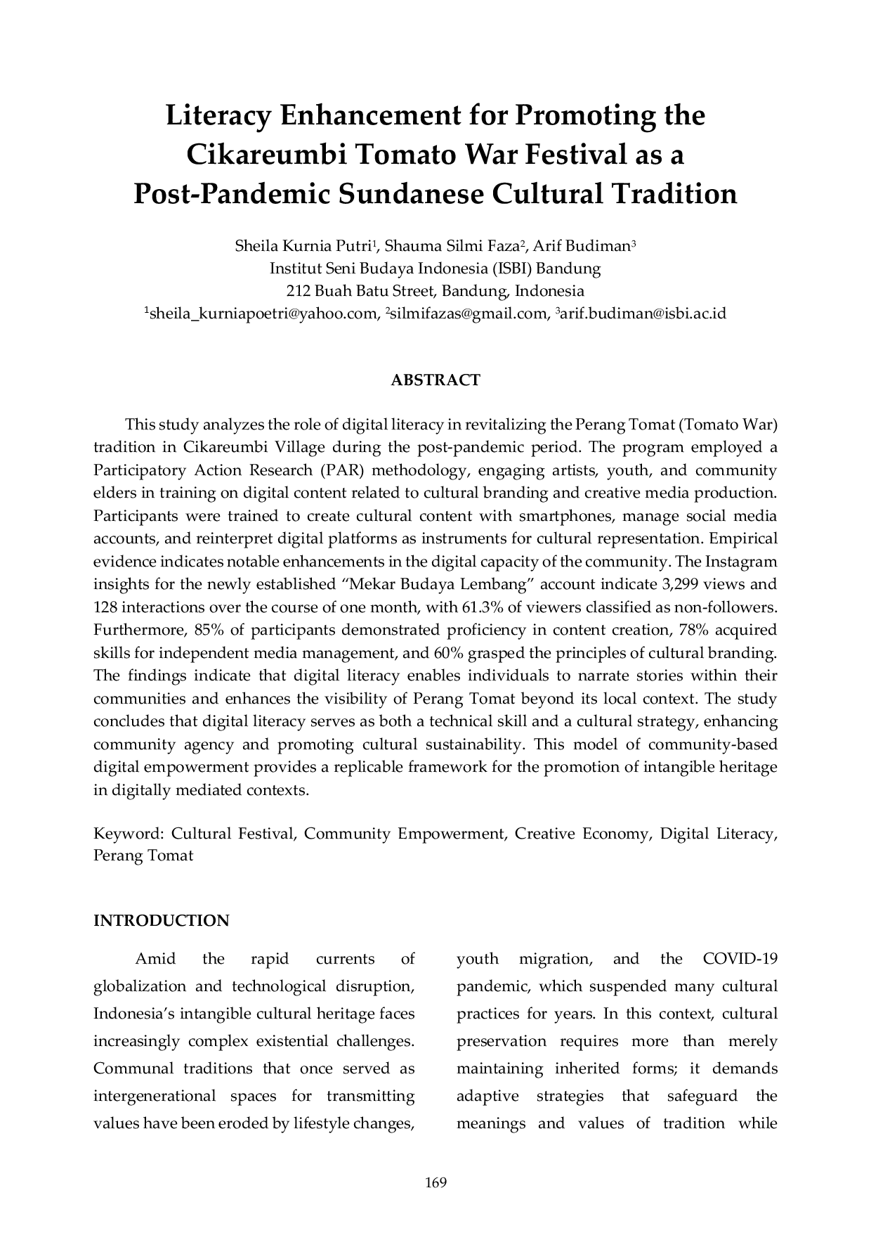 PANTUN: Jurnal Ilmiah Seni BudayaPANTUN: Jurnal Ilmiah Seni BudayaPenelitian ini menganalisis peran literasi digital dalam merevitalisasi tradisi Perang Tomat di Desa Cikareumbi selama periode pascapandemi. Program ini menggunakan metodologi Participatory Action Research (PAR), melibatkan seniman, pemuda, dan tetua masyarakat dalam pelatihan konten digital terkait branding budaya dan produksi media kreatif. Partisipan dilatih untuk membuat konten budaya dengan ponsel pintar, mengelola akun media sosial, dan menafsirkan ulang platform digital sebagai instrumen representasi budaya. Bukti empiris menunjukkan peningkatan yang signifikan dalam kapasitas digital masyarakat. Wawasan Instagram untuk akun “Mekar Budaya Lembang yang baru didirikan menunjukkan 3.299 tampilan dan 128 interaksi selama satu bulan, dengan 61,3% penonton diklasifikasikan sebagai non-pengikut. Selanjutnya, 85% partisipan menunjukkan kemahiran dalam pembuatan konten, 78% memperoleh keterampilan untuk manajemen media independen, dan 60% memahami prinsip-prinsip branding budaya. Temuan menunjukkan bahwa literasi digital memungkinkan individu untuk menceritakan kisah-kisah dalam komunitas mereka dan meningkatkan visibilitas Perang Tomat di luar konteks lokalnya. Studi ini menyimpulkan bahwa literasi digital berfungsi sebagai keterampilan teknis dan strategi budaya, meningkatkan agensi masyarakat dan mempromosikan keberlanjutan budaya. Model pemberdayaan digital berbasis komunitas ini menyediakan kerangka kerja yang dapat direplikasi untuk promosi warisan takbenda dalam konteks yang dimediasi secara digital.