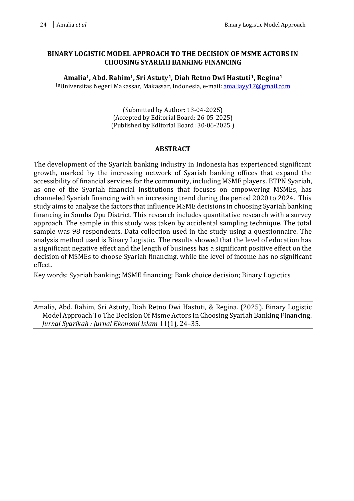 Jurnal Syarikah : Jurnal Ekonomi IslamJurnal Syarikah : Jurnal Ekonomi IslamThe development of the Syariah banking industry in Indonesia has experienced significant growth, marked by the increasing network of Syariah banking offices that expand the accessibility of financial services for the community, including MSME players. BTPN Syariah, as one of the Syariah financial institutions that focuses on empowering MSMEs, has channeled Syariah financing with an increasing trend during the period 2020 to 2024. This study aims to analyze the factors that influence MSME decisions in choosing Syariah banking financing in Somba Opu District. This research includes quantitative research with a survey approach. The sample in this study was taken by accidental sampling technique. The total sample was 98 respondents. Data collection used in the study using a questionnaire. The analysis method used is Binary Logistic. The results showed that the level of education has a significant negative effect and the length of business has a significant positive effect on the decision of MSMEs to choose Syariah financing, while the level of income has no significant effect.