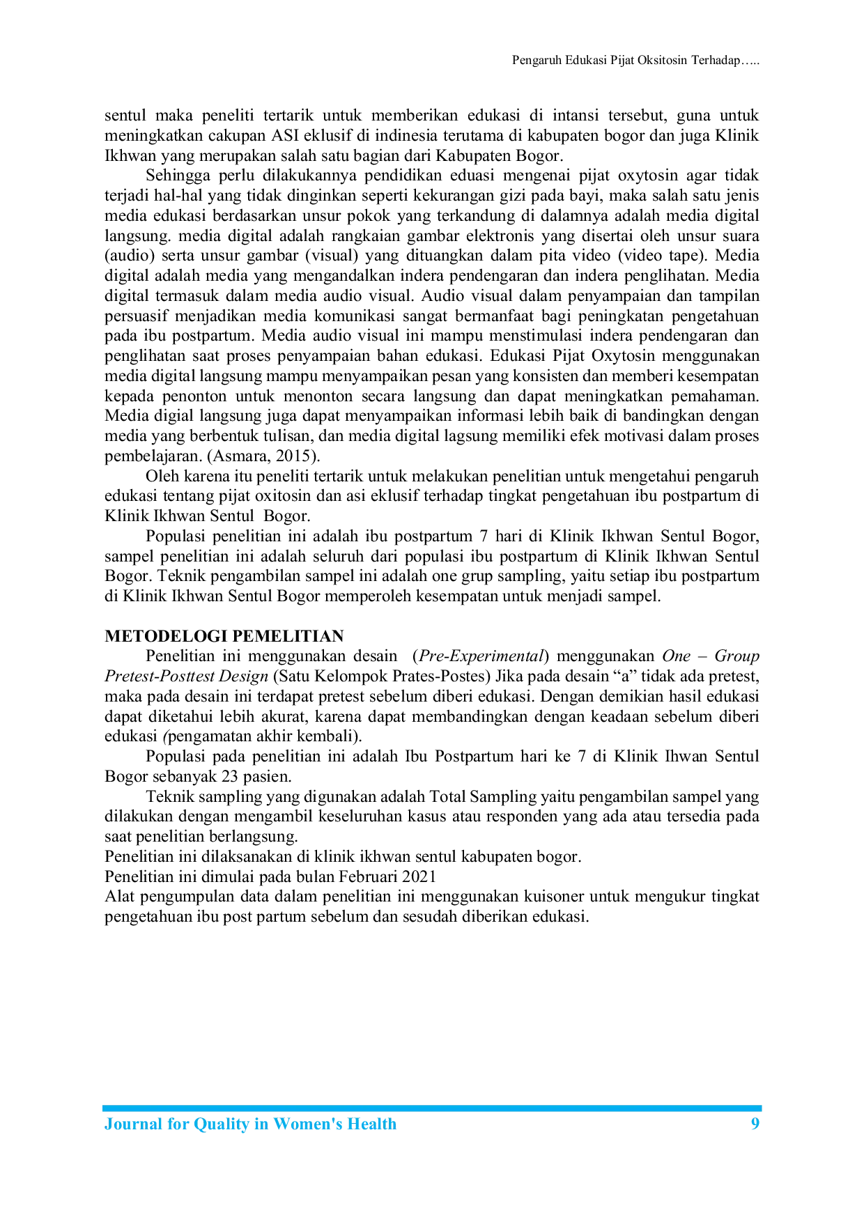 Journal for Quality in Women's HealthJournal for Quality in Women's HealthPijat oksitosin merupakan salah satu solusi untuk mengatasi kurangnya ASI. Jumlah rata-rata pemberian ASI eksklusif di dunia berkisar 38%, meskipun sebagian besar perempuan di Indonesia menyusui anak mereka. Hanya 42% dari bayi yang berusia di bawah 6 bulan yang mendapatkan ASI eksklusif, sehingga perlu bagi tenaga kesehatan untuk memberikan edukasi mengenai pijat oksitosin sebagai salah satu solusi mengatasi masalah ASI, terutama bagi ibu postpartum. Desain penelitian menggunakan pre-experimental dengan rancangan one group pretest–posttest. Sampel dalam penelitian ini berjumlah 23 responden dengan teknik pengambilan sampel total sampling. Instrumen penelitian terdiri dari kuesioner tentang pijat oksitosin yang telah diuji validitas dan reliabilitas dengan nilai koefisien Cronbachs alpha pada kuesioner pengetahuan sebesar 0,889. Data dianalisis menggunakan analisis univariat dan analisis bivariat dengan uji Wilcoxon untuk mengetahui perbedaan sebelum dan sesudah diberikan edukasi melalui media Google Meeting. Hasil penelitian menunjukkan bahwa terdapat pengaruh pengetahuan sebelum dan sesudah edukasi dengan nilai p-value 0,00 < α = 0,05. Media edukasi Google Meeting dapat meningkatkan pengetahuan responden tentang edukasi pijat oksitosin, khususnya terhadap pengetahuan ibu postpartum.