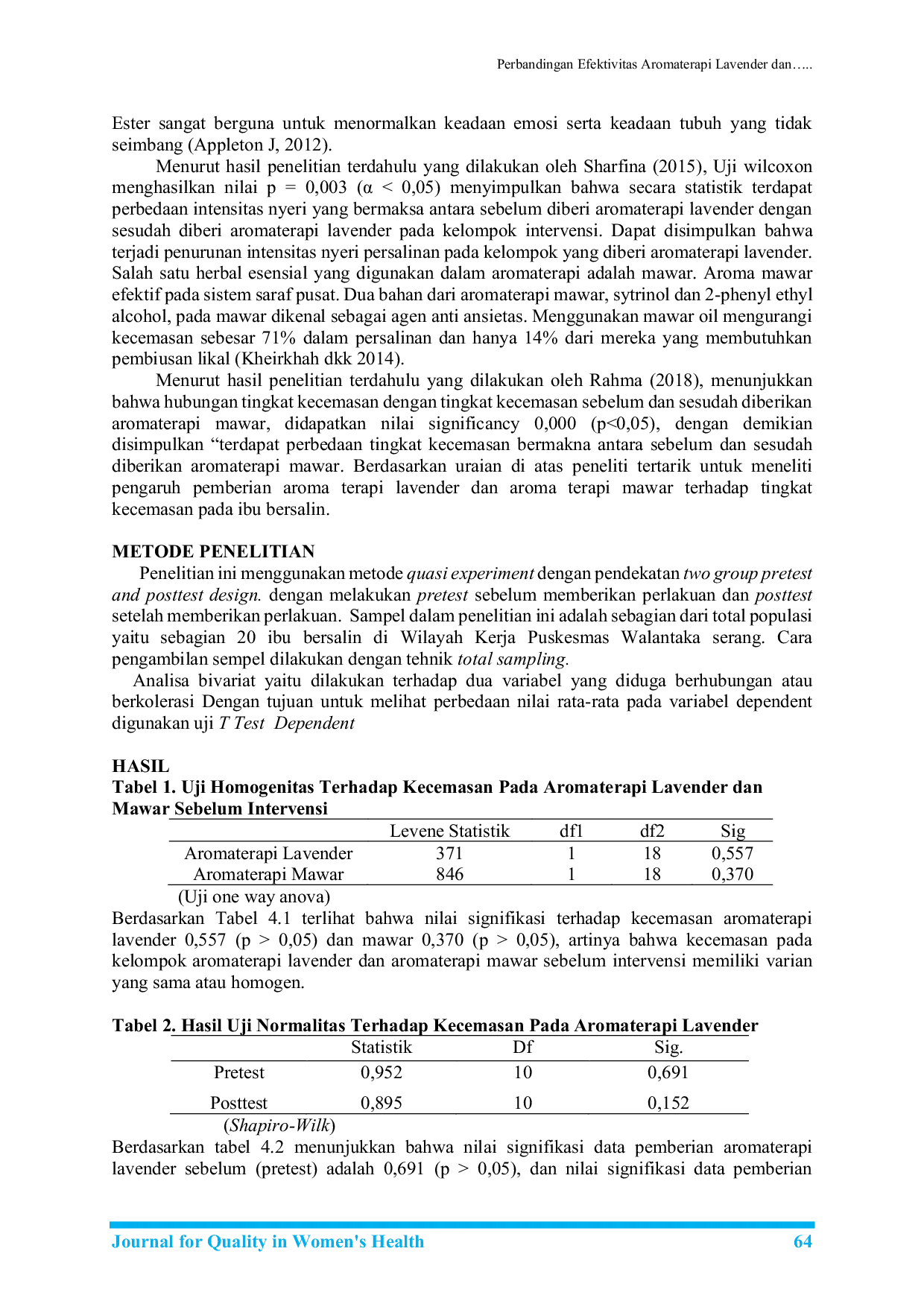 Journal for Quality in Women's HealthJournal for Quality in Women's HealthUmumnya, ibu yang akan bersalin akan merasakan perasaan cemas dan takut. Rasa takut dan cemas akan sangat buruk akibatnya dalam proses persalinan. Ibu yang sedang bersalin mengalami tingkat kecemasan yang meningkat. Penelitian ini bertujuan untuk mengetahui pengaruh pemberian aromaterapi lavender dan aromaterapi mawar terhadap tingkat kecemasan ibu bersalin di Wilayah Kerja Puskesmas Walantaka. Data di analisis menggunakan uji t test untuk mengetahui perbedaan efektivitas aromaterapi mawar dan lavender terhadap kecemasan pada ibu bersalin. Pengambilan data sampel dibagi dua, yaitu sampel 10 kelompok ibu bersalin dengan terapi lavender dan 10 kelompok ibu bersalin dengan terapi mawar. Instrumen penelitian terdiri dari lembar observasi pemberian aromaterapi di wilayah kerja puskesmas Walantaka Serang tahun 2020. Hasil penelitian menunjukkan bahwa ada pengaruh yang signifikan sebelum dan sesudah pemberian aromaterapi lavender (p<0,05) dan ada pengaruh sebelum dan sesudah pemberian aromaterapi mawar (p<0,05). Tidak ada perbedaan yang signifikan antara aromaterapi lavender dan mawar terhadap kecemasan ibu bersalin (p>0,05). Bidan penolong persalinan bisa menggunakan aromaterapi mawar untuk menurunkan tingkat kecemasan terhadap ibu bersalin.