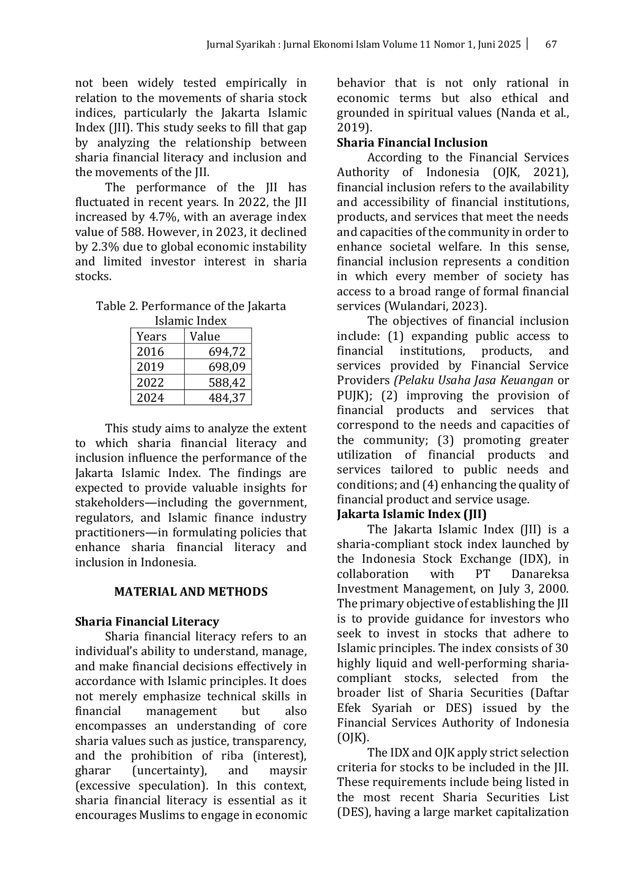 Jurnal Syarikah : Jurnal Ekonomi IslamJurnal Syarikah : Jurnal Ekonomi IslamThis study aims to analyze the effect of literacy and sharia financial inclusion on the performance of the Jakarta Islamic Index (JII) in 2016, 2019, 2022, and 2024. The research approach used is quantitative with secondary time series data obtained from the Indonesia Stock Exchange (IDX) and the Financial Services Authority (OJK). The analysis was conducted through classical assumption tests and multiple linear regression using SPSS 27. The results of the study indicate that neither Islamic financial literacy nor inclusion, either partially or simultaneously, has a significant effect on JII performance, with significance values above 0.05. The negative regression coefficients for both variables indicate that increases in literacy or inclusion do not necessarily drive an increase in JII performance. This is likely due to the dominance of institutional investors in JII transactions and the growth of inclusion being more focused on the banking, insurance, and microfinance sectors compared to the Islamic capital market. The insignificant F-test and t-test results suggest that other factors, such as macroeconomic conditions and issuer performance, have a more dominant influence on JII movements. These findings underscore the need for policies that link Islamic financial literacy and access to participation in the Islamic capital market.